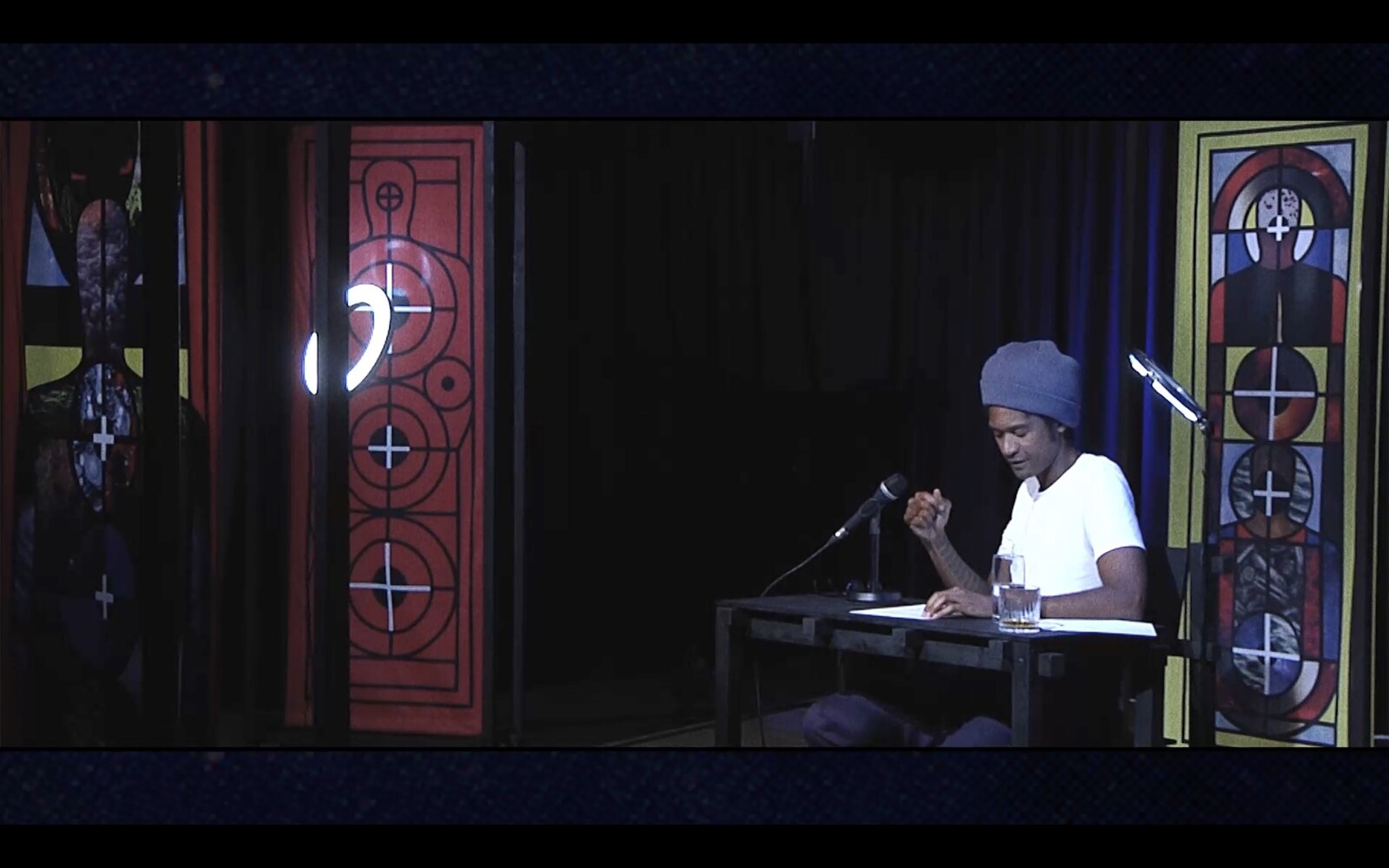 Partly because he is wearing a dark gray shirt and Malcolm X glasses, but mainly because of his charismatic voice and comportment, Mosquito evokes a long line of great Black orators from Frederick Douglass to James Baldwin, as he switches between booming and almost whispering. It’s as if different registers of speech—the serious and the comical, the authoritative and the offensive—have been chopped up and mixed into a salad of address. He offers casual salutations that range from the N-word to “Ladies and Gentlemen.” After discussing the temptation to cite John F. Kennedy, he does so. Performative self-contradiction is the foundation of his act.