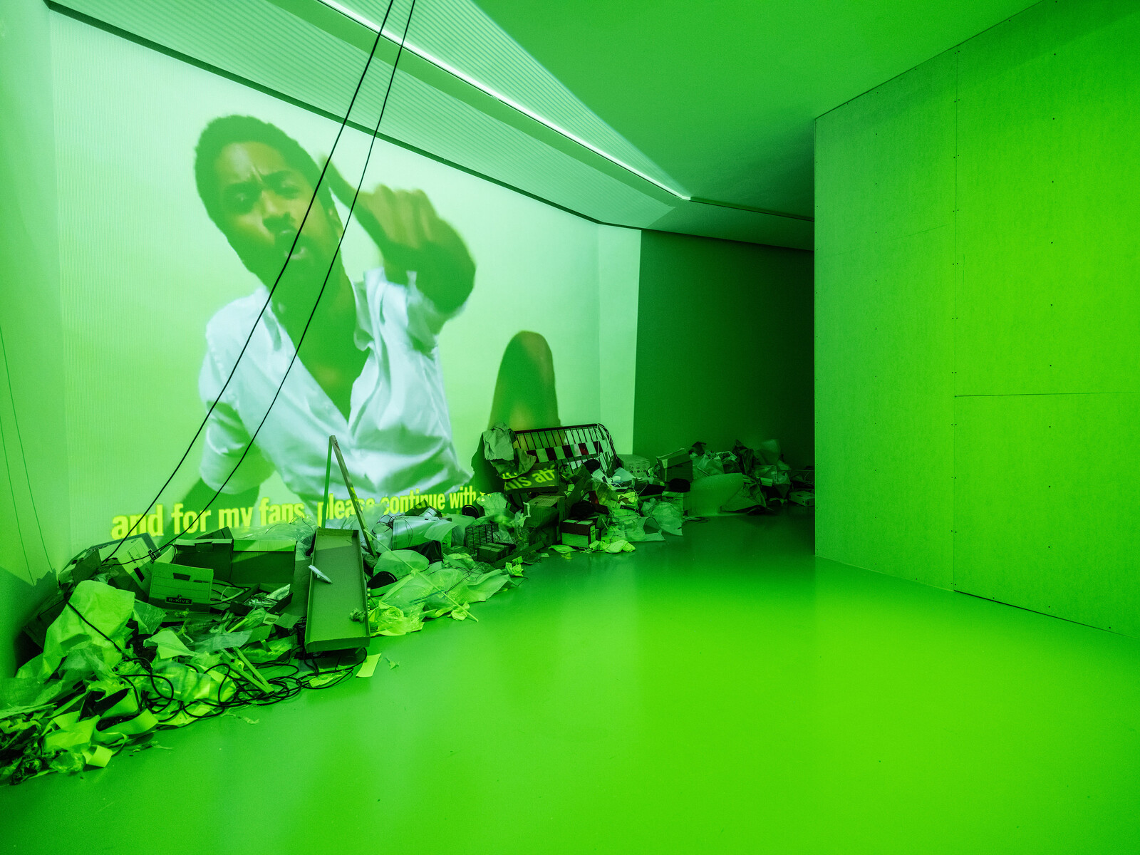 This survey of Nástio Mosquito’s work from the early 2000s to the present begins, before it begins, before it begins. This cascade of overtures starts in the entrance hall of M HKA, which doubles as a reading room. In front of one of the bookshelves, a small cubicle monitor sits on a plinth: it shows Mosquito delivering a speech in the Senaat, one of the two chambers of the Federal Parliament of Belgium.