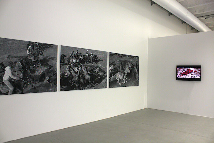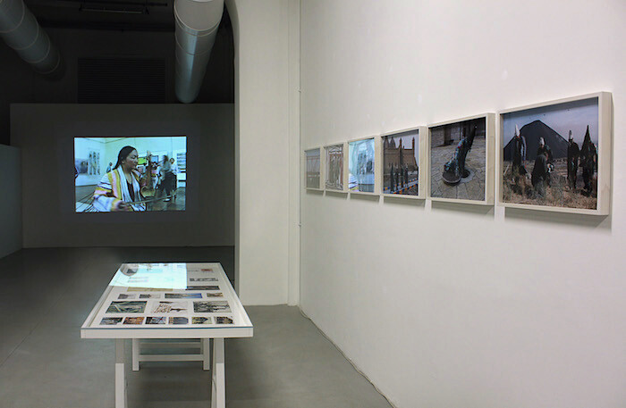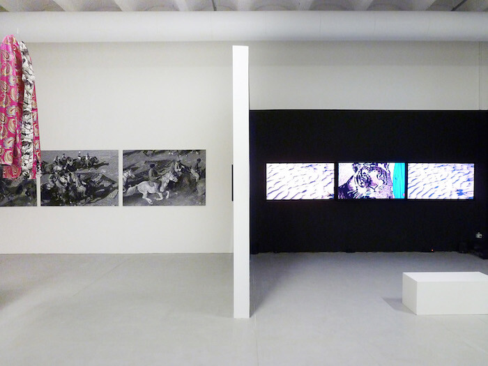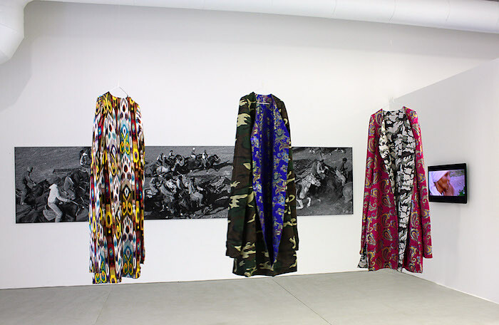 Poetry is an undercurrent of the exhibition, giving the works a delicacy that never becomes overly marked. History is brought into play, but without making too many concessions to it: for instance, there are the reversible kaftans (United States Marine in Central Asia, 2008)—one side buta (paisley) silk, the other camouflage—by Said Atabekov (born in Uzbekistan, based in Kazakhstan), chameleon-like garments that eloquently convey the dialectic between tradition and contemporary forms of colonialism. Or his photos re-enacting epic battles (such as Genghis Khan’s Clothing, 2013). There are a dozen works here by Atabekov, including the video Neon Paradise (2003) which lends the exhibition its title: the artist, seen from behind, kneels in front of the sliding doors of a department store, as if the photocell were some modern-day spirit or demon.