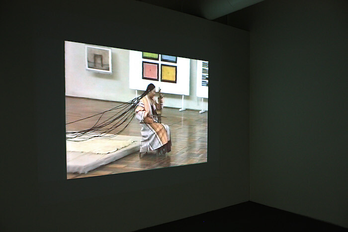 “This video/performance from 2001, titled Farewell Song, was inspired by an age-old custom in Kyrgyzstan, where women are supposed to let their hair grow until it is plaited into very thin braids for their wedding,” the gallery assistant tells me. “And so the scissors are symbolically severing all ties with a past that is felt to be stifling, in order to bid it farewell.” The artist seen here is Gulnara Kasmalieva, who along with with Muratbek Djumaliev (both live in Bishkek) seems to use the act of cutting (a leave-taking, a departure) as one that leads towards the (tribal, animistic, magical, nomadic) heart of their country, even as it yields a compelling visual image.
