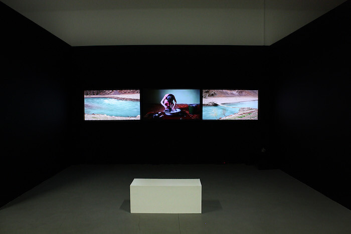 Through it lingers on the parched bed of the Aral Sea, the three-channel video installation Stains of Oxus (2016) is anything but arid. Following the river Amu Darya (Oxus in Greek), Uzbek artist Saodat Ismailova has gathered the dreams and stories left by those who live along the river’s banks, letting them flow freely. The predominant message is that everything has a soul. A girl recounts her dream of a white horse. A man tells a legend: “There was a girl named Soman. She didn’t want to get married to an old man. She escaped her undesired spouse on a horse. When she arrived here she transformed herself into this lake, Soman.” And once again we find the image of the bride cutting all the ties that bind her, in a song of farewell, fleeing in order to become something else. Snip!—the braid is cut. At the end—in a particularly vivid scene—we see an old man brushing the hair of a little girl reluctantly crouched between his knees. “Now I’ll put your hair into a ponytail,” he tells her. The girl slips away. “She escaped again.”