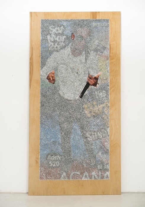 The fourth floor is spare and striking, anchored by two of the exhibition’s most memorable pieces: Diamond Stingily’s ominous, oneiric swing set E.L.G. (2018), and Manolis D. Lemos’s droning loop of an anarchic choreography called dusk and dawn look just the same (riot tourism) (2017). A brick balances atop Stingily’s ten-foot-tall piece, perfectly and precariously, adding an air of danger to the sparse, Goberesque form whose other main features are an overly long ladder stretching skyward and a long chain weighted with something that looks like a piece of plumbing equipment. The ruddy block stands out from the otherwise silver structure and imbues the entire room with a sense of gravity of doomed potential. There’s an airiness and a weightiness to the mise-en-scène: the almost fractal undulations of staples coating Wilmer Wilson IV’s occluded figures appropriated from street advertisements; Tiril Hasselknippe’s welded steel parts hanging from the ceiling like disembodied dinosaur pieces; and, as a non-metallic counterpoint, Gresham Tapiwa Nyaude’s motley canvases skewering Zimbabwe’s sociopolitical anguishes, the largest of which, The New Zimbabwe (2018), is emblazoned with Shona words that translate to “wealth takes turns.”
