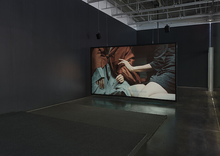 If the fourth floor is a kind of celestial pressure cooker from which revolution is about to erupt, the third floor is a more literal, terrestrial series of works related to industrialization and dehumanization. The most absorbing of Zhenya Machneva’s woven landscapes and still lives of factories and machines is titled Guillotine (2018) and depicts a bandsaw both with hard-edged minimalism and an almost impressionistic irregularity of wear. The pungent hues of Chemu Ng’ok’s portraits, like In Denial (2016) and The Boundary Wall (2017), with their macerated, indistinct faces and runny, tendrilly details claim to tell complex stories about women’s labor in the context of Kenya, although their stylization registers more broadly as having to do with seeing the world as composed of obliterated, expressionistic figures. Wong Ping’s garish, 8-bit inspired Wong Ping’s Fables 1 (2018) projected in a theater around the corner conclude with abstruse, nihilistic aphorisms like “Talent would never go unrecognized, only could people be born in a wrong time. Your time will come when vulgarity and bad taste become trends.” This one could apply to Wong’s video, although the erratic digital nostalgia trend is already late.