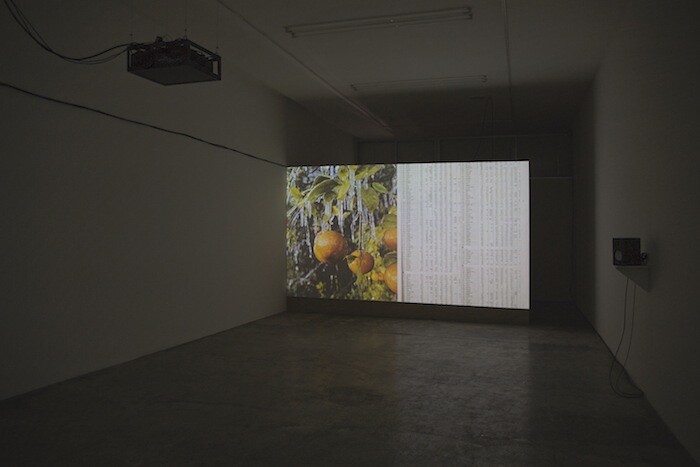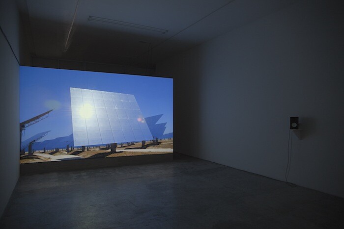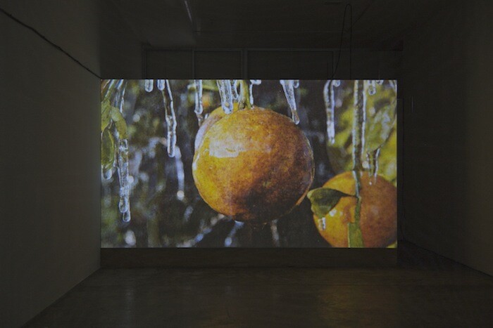 Scientists have long considered how solar variations—like sunspots—might relate to changes in climate and associated human activities. Mangan’s first film—displayed close to the gallery entrance on a suspended wall, at 90-degree angle to the room’s right wall—charts and compiles these investigations. The 13-minute loop presents a montage of different footage: the sun reflecting off the heliostats at the Gemasolar Thermosolar Plant in Andalucía; the air contamination visible in the skyline of Mexico City; audiovisual data from NASA’s Solar and Heliospheric Observatory project, which tracks the relationship between sunspots and weather changes; oranges covered in frost during an unseasonable cold snap in Florida, which caused a corresponding fall in market price; rotating dendrochronology specimens of the Laboratory of Tree-Ring Research at the University of Arizona; and notes from the Soviet-era scientist Alexander Chizhevsky, who related solar cycles to revolutionary activity throughout history.