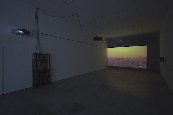 Mangan’s interest in alternative sources of power can be traced back through his earlier works. In Progress in Action (2013)—a reflection on the Bougainville Civil War (fought between Papua New Guinea and islanders seeking independence) and a tribute to the Bougainville Revolutionary Army’s use of coconuts as an alternative source of fuel—the artist used refined copra oil to power the installation engines. Solar energy also gives life to “Ancient Lights.” The two-channel installation is powered by solar panels installed on the gallery’s roof. Although the electrical system is sculpturally installed between the two projections, the solar panels are not accessible to the public, leaving the visual cycle incomplete. This sustainable system will remain in place beyond the duration of the show and thus have an enduring impact on the gallery. This is a political reminder of the imperative to develop renewable and sustainable sources such as solar power as an alternative to fossil fuels. This need is felt particularly urgently in Mexico City, where the the level of pollution is frequently toxic. Though there is some investment in renewable energies in Mexico, solar power requires more laws, policies, and institutions, meaning political will, to regulate and promote systems of clean energy that have vital benefits for the quality of the environment and public health.
