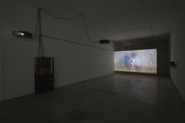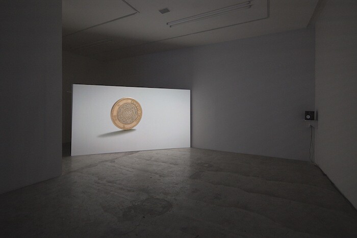 In the second film— projected onto another suspended wall, at a more acute angle—concentric patterns can be found in a Mexican ten-peso coin depicting the Aztec Sun Stone, which has a solar deity carved into its center, and on the subsequent rings of astronomical data and chronological cycles. The coin in the film dances relentlessly in circles. The artist, in an accompanying interview, draws special attention to the fact that the Aztecs thought that the everlasting nature of the sun was dependent on human sacrifice. He relates this mythology to economics, according to which the extraction of any energy demands some kind of loss. But, as the first law of thermodynamics states, energy only transforms from one state to another, it never dies. We might say that the film highlights the different conceptions of energy transferences throughout time, with the sun as the fundamental source.