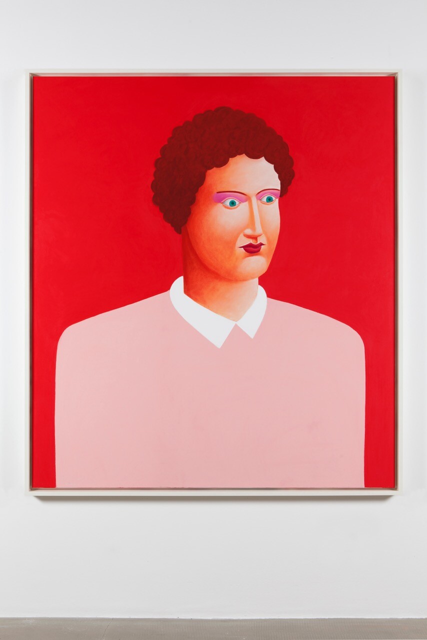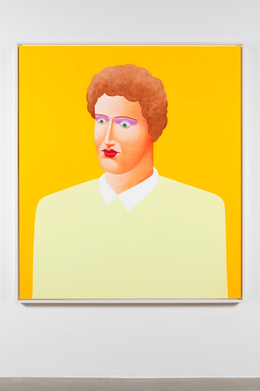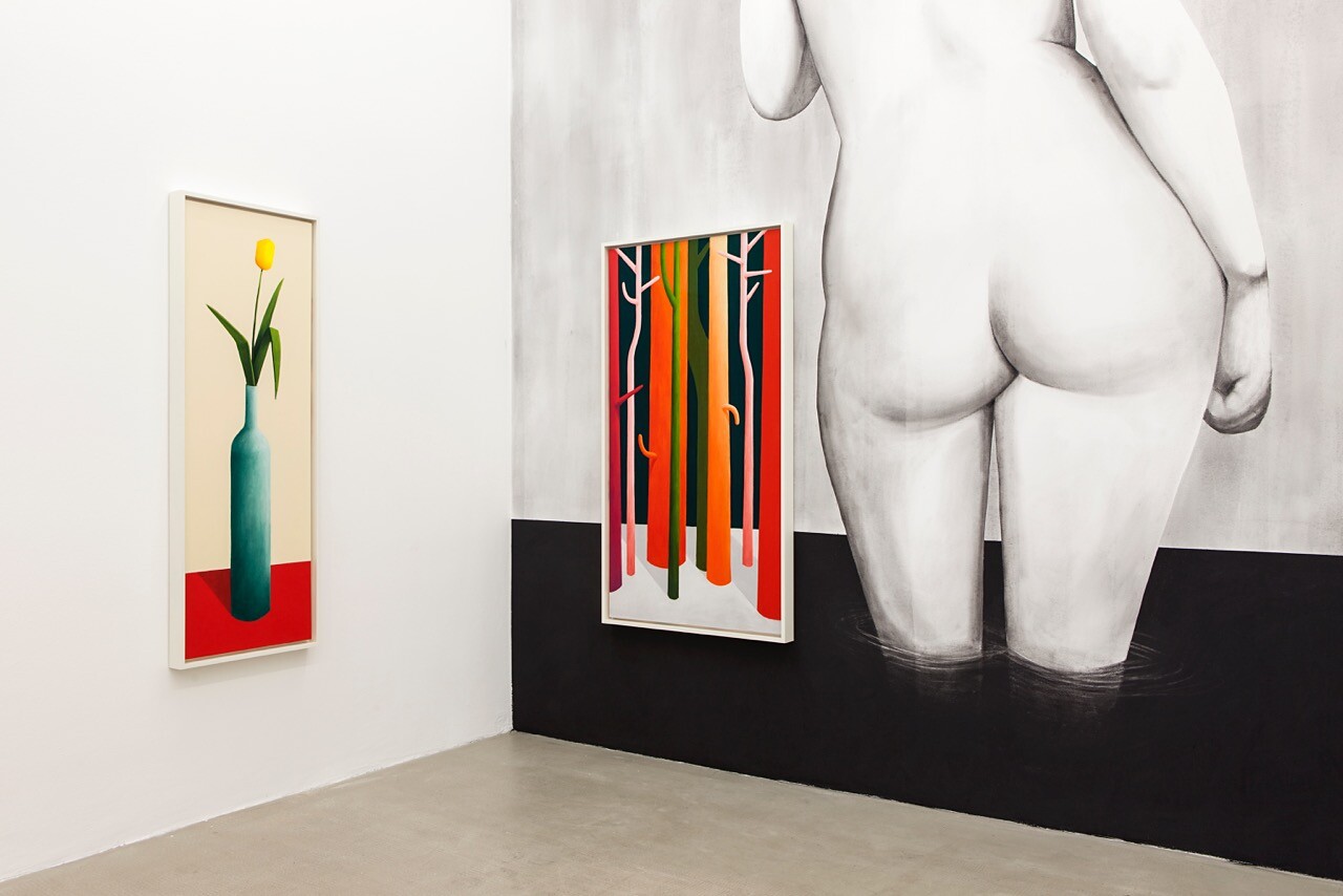 Aloof and absorbed in their own leisure, the two modest bathers that Nicolas Party has drawn in charcoal on the white-plastered walls of the kaufmann repetto gallery, in a style evocative of Guercino or a certain vein of nineteenth-century painting, are the nude horizon for the first solo show by this Brussels-based Swiss artist—appropriately titled “Two Naked Women.” These portraits function as a sort of classical, nostalgic backdrop, which imbues the about fifteen works on view with a rarefied, languorous mood, warding off any impatience or haste. These works are for the most part pastel on canvas (all dated 2015, and of slow gestation), whose literal titles—Portrait, Still Life, Landscape—betray a keen interest in certain tropes and stylistic elements from the history of painting (Leon Battista Alberti’s spatial renderings; Jean-Baptiste-Siméon Chardin’s geometry; Paul Cézanne’s stylizations; the naivety of the Fauves or David Hockney’s sluggish tones), and predominantly use a palette of bright colors with a tropical sparkle: vibrant ochre, cynical red, tender pink, fiery orange, bile green, cobalt blue.
