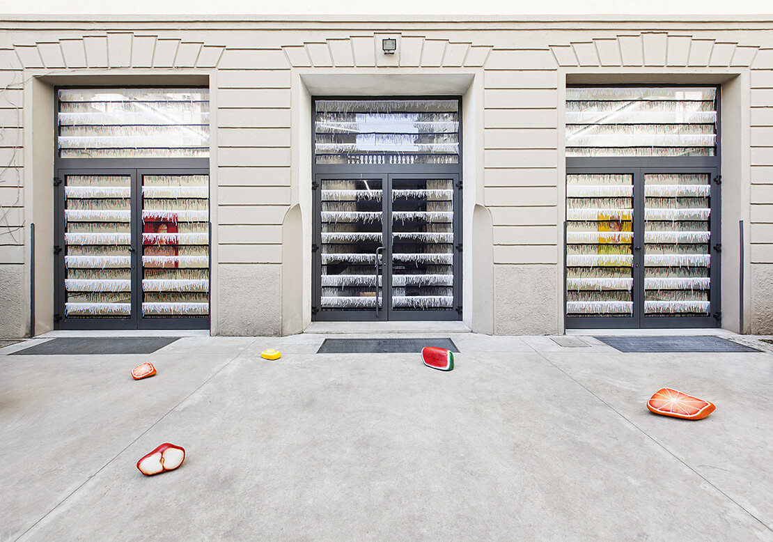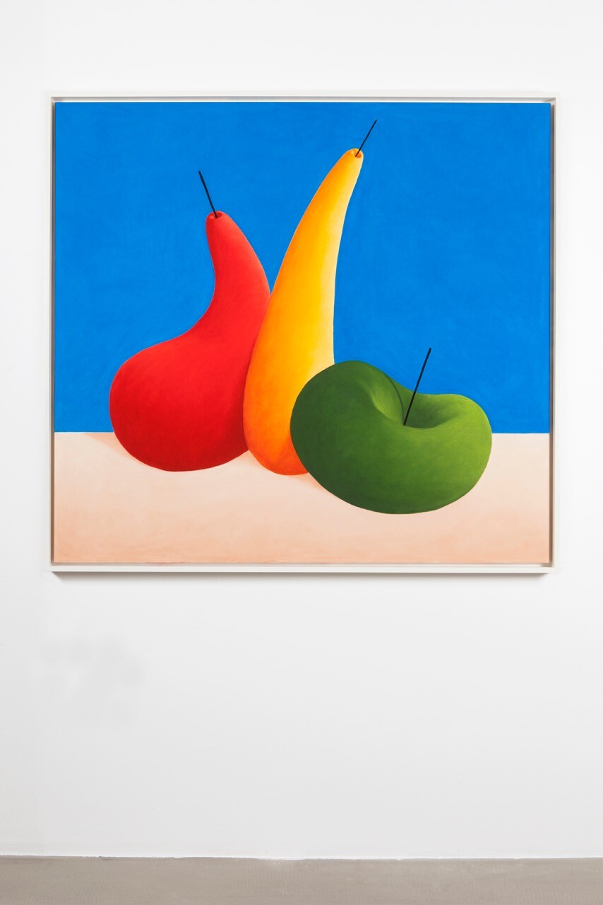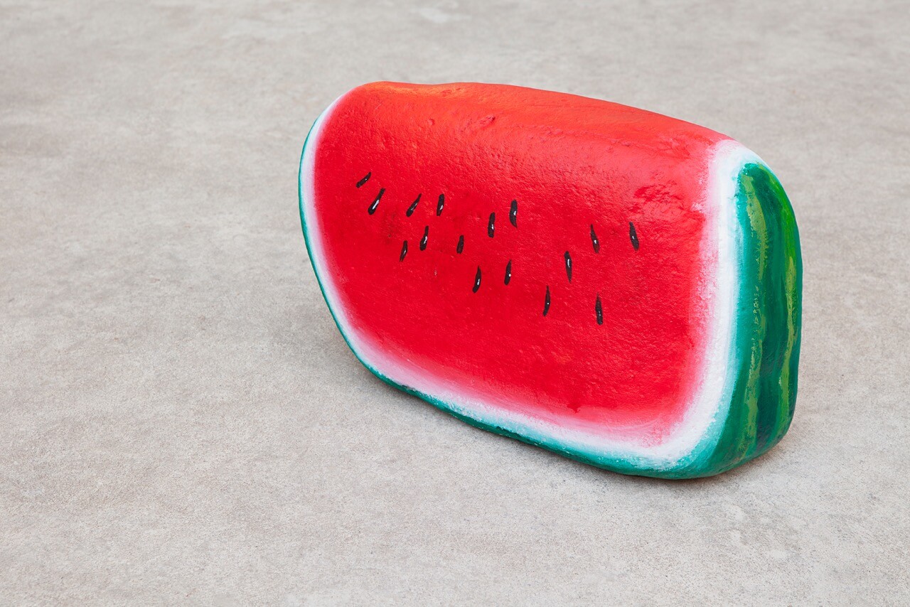 Outside, the entrance to the exhibition space is ringed by produce of every season, rolled out as if for some outlandish fruit salad—watermelon, apples, pears, oranges, lemons—made of hard stone, deceptively painted and definitely oversized. Ill-suited for juice or smoothies, these rocks, hunted down in the outskirts of Milan according to precise parameters given, then transformed into a different substance with acrylics, offer the artist a pretext to dabble in optical illusion—it must have been the form of the stones that suggested the fruit. One is reminded of the sixteenth-century Bolognese baron Ulisse Aldrovandi, who spent all of his time and energy coming up with names and resemblances for the polished pebbles that the capricious bends of the Rio delle Meraviglie transformed into curiously shaped sculptures. That is what painting seems to be for Nicolas Party: a game with infinite possibilities.