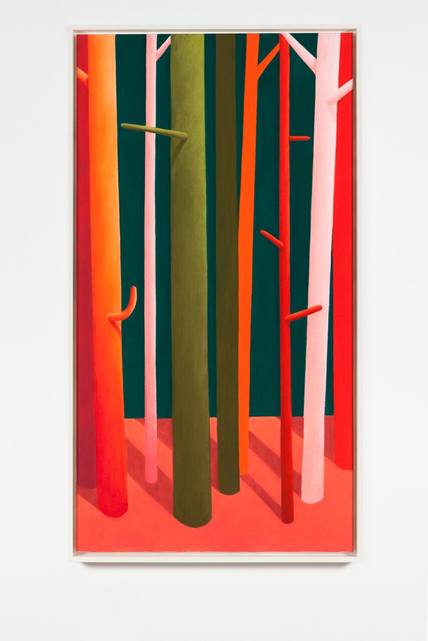 Bathed in the same uniform ruddy light, the thin, bare trunks in the “Trees” series—decidedly short on leaves and branches, looking shorn of their roots, with no owls or squirrels to give them a semblance of habitability—appear as they are framed by a window thrown open at night, outlined in a time of empty moments, the same that pours down on the rocky moon-fields of the “Landscape” series. In a similar way, one can consider the streamlined flowers, gummy-looking fruit, and geometric pitchers in the “Tulips” and “Still Life” series to be completely imaginary, the kitchen serving as a temporary stage for a parade of solitary and somehow comforting, familiar objects that have reminded some of the clustered compositions by Giorgio Morandi—although, compared to the “bottle painter,” Party’s unsubstantial still lifes seem to have undergone a sort of spiritual disinfestation that has drained them of any metaphysical element or sense of vertigo.