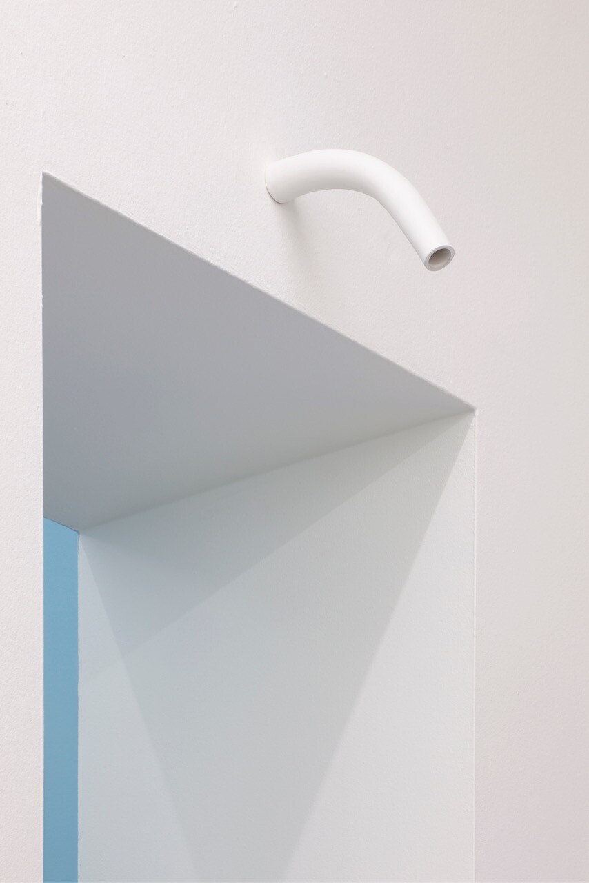 But Nicolas Party is above all an artist capable of sliding, with a certain lightness and irony, from the plane of pictorial representation into the concrete fabric of reality, while always preserving an analogous sense of time standing still. A suspended time, which rises from his solipsistic and solitary subjects emotionally detached from reality or from his odd sculptures with their unnatural colors and dreamlike forms. Difficult to identify at first, a large number of white porcelain teapot spouts (a recurring subject in many of the artist’s paintings, along with coffee pots) seem to have slipped away from their canvases and pigments in the brightly colored “Still Life” paintings and flown up to the ceiling, from which they pour an invisible brew into the air, filling the show with a delightful vivacity. And the insistent, sputtering refrain of spray-painted white and black lines (“Decorative Graffiti”) that runs with dogged conviction over the front windows of the gallery renounces any figurative, stylistic, or provocative ambition, becoming, in its alternation of somewhat weepy drippings and lace, a purely ornamental pretext for a decorative composition.