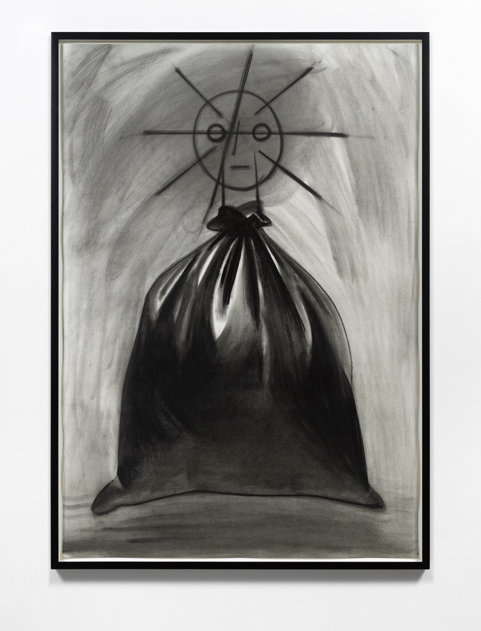 Hanging in the main space of the gallery is a series of charcoal drawings. In one, titled A Sun-headed character in a garbage bag (2022), Kadan renders a black trash bag akin to those rumored to have been used to transport the bodies of soldiers killed during Russia’s invasion. Over the trash bag presides an unsmiling black sun. In another, similar drawing (The Sun I, 2022), a black sun rises from a barren field, its stiff rays referencing the same window grates as Private Sun. The trauma of nuclear meltdown is historically tied to the Chernobyl disaster: as an alchemical symbol, a black sun is used to illuminate the dissolution of the body, a blackening of matter, or putrefaction. Its likeness is often used to refer to the use of nuclear weapons and eternal winter, which lends the exhibition its prevailing air of nuclear anxiety.