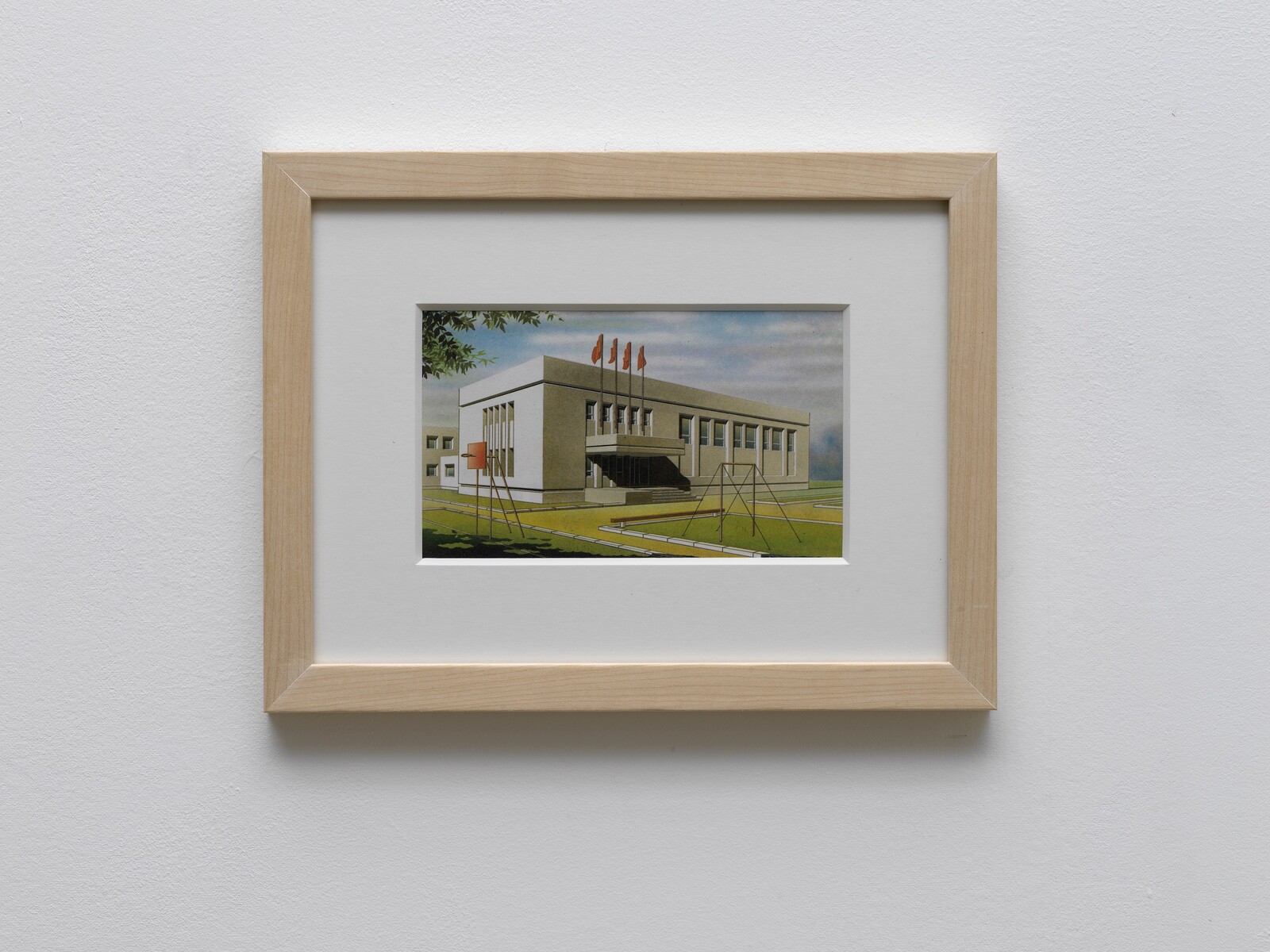 A series of small, simple architectural renderings of children’s schools, annotated in Russian, lead towards the back room where a projected photograph of a burned-out window (in an unnamed location) is facing the sculpture. As a backdrop, it activates the Tiger’s Leap as an object of potential violence. On a small shelf nearby, twisted fragments of green melted glass, presumably from the same site as the photograph, are presented like artefacts on a light table. Their translucent forms create a spectral, liquid spill. The projection, glass fragment, and small architectural renderings are altogether one deeply moving piece, Exhibition (2018), which appears to criticize the apparatus that turns violence into objects of display. Back in the main space, the viewer is drawn towards a large photograph of a pedestrian underpass beneath Obolon Station in Kyiv, which has been turned into a bomb shelter. The specific entrance in the photograph is said to be blocked, yet it suspends a momentary sense of possibility. Against the nuclear-bright sun, the soft darkness invites the viewer in. Anything, it suggests, is better than that.