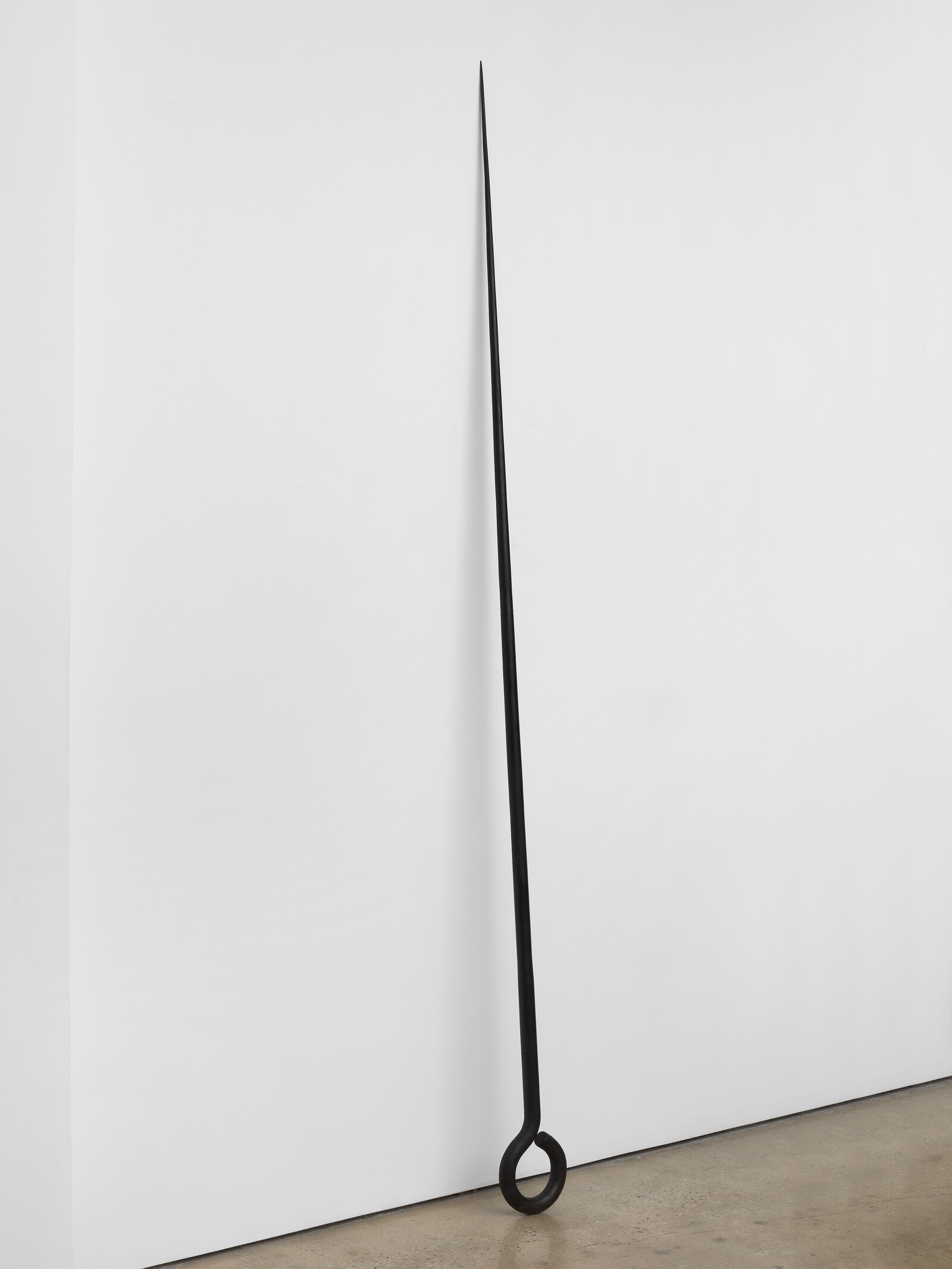 The dark rising sun represents what Kadan calls an “eschatological optimism” emerging from the soil, emanating darkness. That morbid fascination with the productivity of the soil and its revolutionary potential is taken a step further at the back end of the gallery, where the artist has placed Tiger’s Leap (2022): an artefact from an ongoing series of works that includes enlarged versions of industrial and agricultural tools—remnants from the 1905 revolution—found by Kadan at the National History Museum of Ukraine. Utilizing Walter Benjamin’s notion of a “tiger’s leap into the past,” Kadan explains that the work is flung “back into a darkness that came before the sun rose,” the darkness referring to continental European history. With it, Kadan attempts to interrupt homogenous time in a rejection of abject historicism. Benjamin’s approach understood the present as a body resonating with the past in a state of constant flux. In this iteration, the wrought iron sculpture evokes the exploitation of Ukraine’s natural resources while questioning our relations with mythical “giants,” visionary figures of the past.