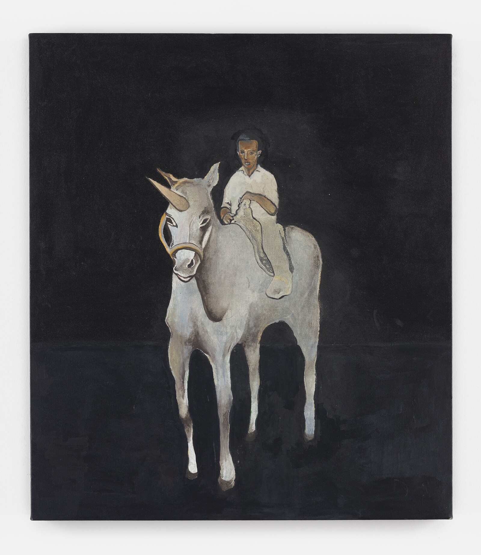 Steadying these wobbly dreamscapes are bleak facts folded in with the fantastical. In the somnolent 40 Acres and a Unicorn (2007), hung in the dimly lit upper galleries, a man enveloped by an amorphous black background sits atop a unicorn. The title is a callback to the “forty acres and a mule” proclamation of 1865, a form of reparations proposed during the Civil War that would take land from slave owners and give it to formerly enslaved people. This never took place, and like the idealized “mule” set against an emptied landscape, turned out to be mere fantasy. Other works in this section (“Domestic Spirits”) take stereotypes of Black culture (Bad Boy for Life, 2007, or Single Mother with Father out of the Picture, 2007–08) and suffuse them with Davis’s surreal brand of critique and humor.