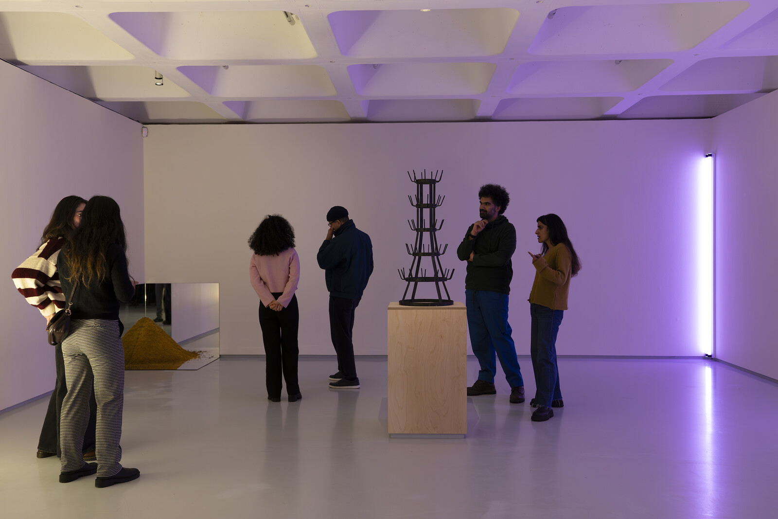 He continued that role at the Underground Museum, represented here by two reconstructions of past shows. A meditation on the creative process, Journey to the Moon (2003) by William Kentridge, whose work also has surreal, dreamlike reverberances, is given its own space downstairs. Upstairs, there is a restaging of the museum’s inaugural exhibition “Imitation of Wealth,” on a smaller scale than the original. When museums proved reluctant to lend artworks to this new venture in Central Los Angeles, Davis decided to remake work by artists such as Marcel Duchamp (the 1914 bottle rack), Jeff Koons (one of the 1980s vacuum cleaner sculptures), and Dan Flavin (some purple-hued strip lights) instead. The name of the show is another in-joke: it’s a nod to Imitation of Life, Fannie Hurst’s 1933 novel about racial passing in the early twentieth century.