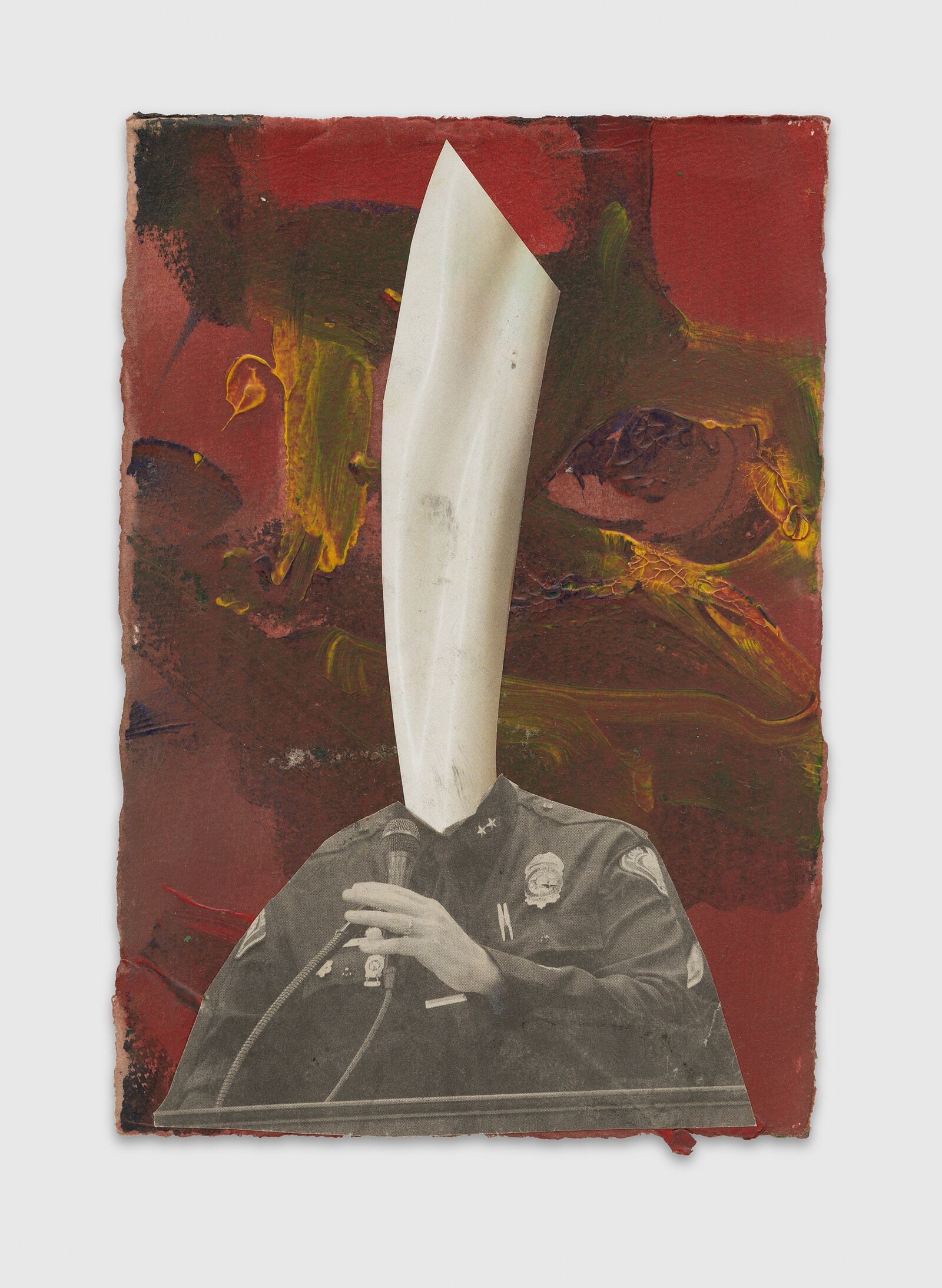Towards the end of the show are the small-scale collages that Davis created while undergoing chemotherapy. Affixed to archival paper painted in washes of color are more sketches on paper, photographs, and images clipped from magazines. Viewing these constellations of things he cared for offers an insight into his innermost workings as an artist. I come to understand his other works as collages too: bringing together social history, mythology, community work, and the documentation of everyday life into an expanded understanding of what painting could be. This might explain why, when Davis was asked in a 2009 interview what motivated him to be a painter, he replied, “I just couldn’t do anything else. I’d rather fail at painting than be successful in anything else.”2