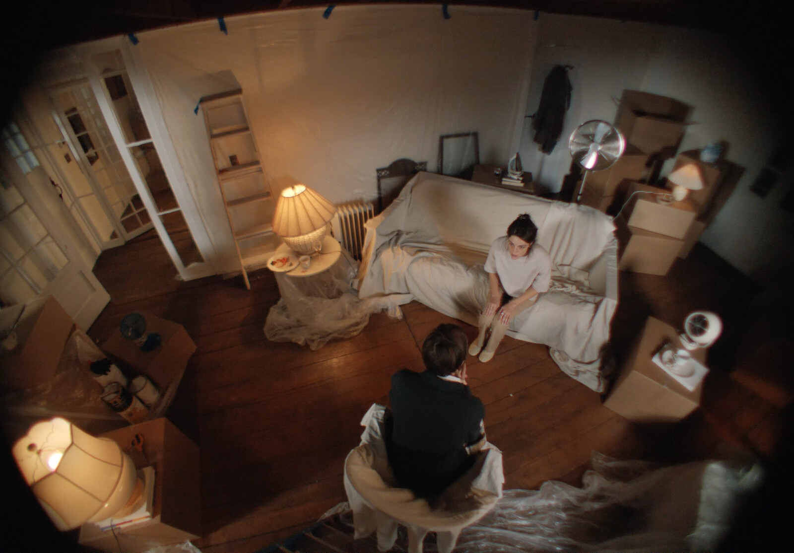 Here, each sculpture is partially comprised of various home appliances—shower curtain rods, kitchen utensil holders, lamp cords, and wastepaper bins—that make up the ostensible fans, the blades of which are moulded into the shape of butterfly wings. These appliances reference her most recent short video, Appliance (2024), which debuted earlier this year in the American artist’s first extensive institutional solo exhibition in the US, at Contemporary Arts Museum Houston. It is also screening here, in the gallery’s adjacent viewing room. Consistent with Erlanger’s use of science fiction and horror in earlier works to explore the psychology underpinning the idea of home, she here depicts absurd situations—the arm of a contractor inexplicably reaching out of a perfectly rounded, porthole-like circle carved into the floorboards, or the imprint of an electrical socket appearing on the protagonist’s cheek like the branded scar from a hot iron only to disappear—that demonstrate the character’s crumbling mental state.