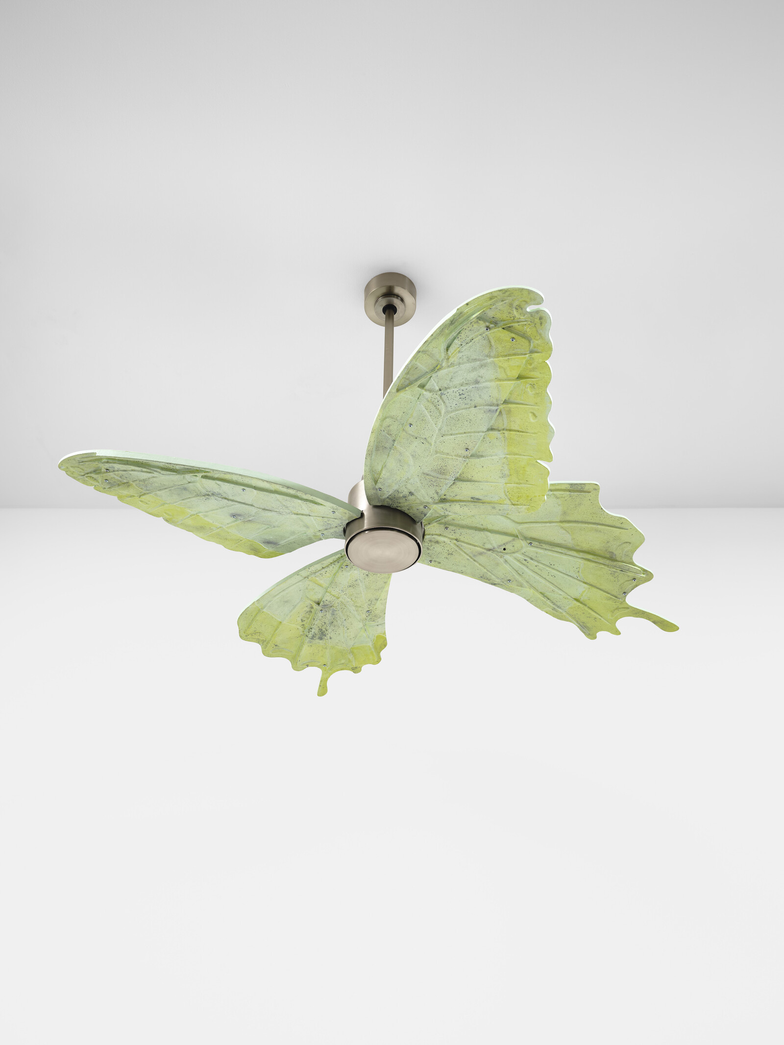 A press release cites Lydia Kallipoliti’s concept of “closed worlds” to describe the human impulse to create self-contained, “climate-controlled” environments, despite the potential for damage to the wider environment. Though it’s not clear how cooling the air by use of a fan could be directly harmful to the “outside, so-called ‘natural’ world,” at least in the sense outlined in Kallipoliti’s term, it points to the felt need to control the physical environments in which we live. Meanwhile, the exhibition literature informs us something that cannot be inferred from the work itself: the butterfly wings reference Batesian mimicry, a strategy whereby harmless species take on the traits of harmful ones to avoid being eaten by predators.