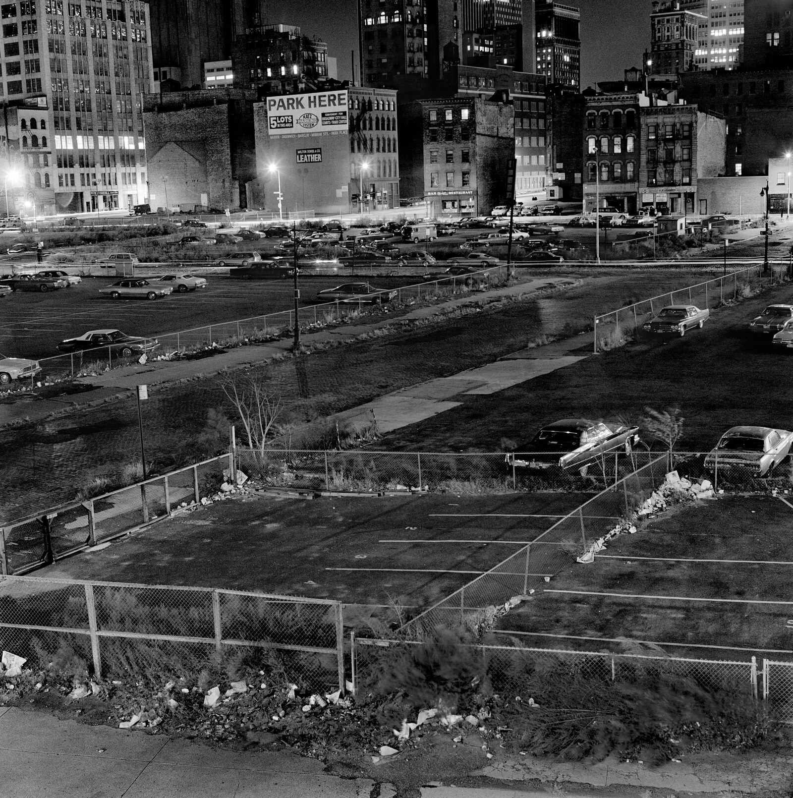 There are no copies of Newspaper in Hujar’s personal archive, and the question is open as to what importance he attached to it later in life. But elements of its formal strategies can be traced through the more significant photographic work of the 70s and 80s, for instance in the photograph West Side Parking Lots, NYC taken on the Lower West Side in 1976. The car park is, of course, a formal grid, as are the forms of the commercial buildings that surround it, but as with so many of Hujar’s images of the gridded totems of midtown Manhattan or the Financial District, the image is composed in a series of diagonals that cut across the squares of the formation, that break the formal solidity of the box. There is also a queer joke embedded in this picture: the words “park here” printed on the building top-left, and below them the word “leather.” These parking lots were a cruising ground for gay men in the 1970s, and they were near the infamous leather club The Mineshaft, which was located at 835 Washington Street.