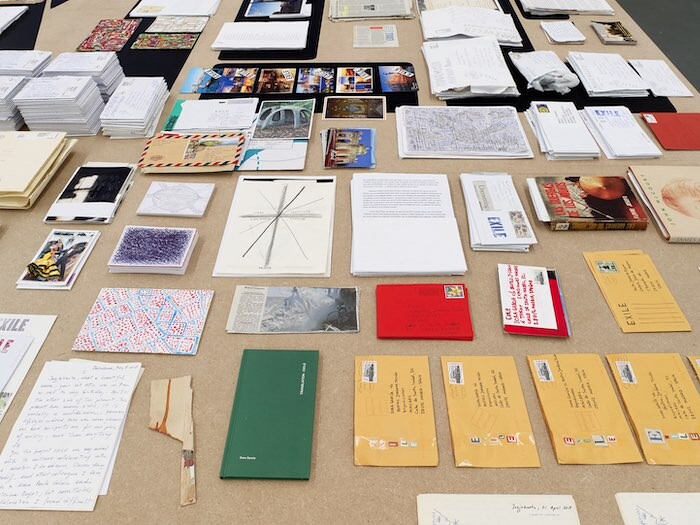 “A group exhibition” also interrogates your positions as “viewer” and “reader”: the viewer in you takes in the bigger picture, while the reader attends to details. You are placed in the position of a mobile witness as you move from one of Emily Jacir’s Inbox (2014–15) paintings to the next. These small paintings of emails, which Jacir received from Palestinian exiles, resonate with Mahmoud Khaled’s Do You Have Work Tomorrow? (2013), a framed black-and-white photo series of screenshots of Grindr conversations on a smart phone. Radically different in content, the chromatic sincerity of Jacir’s black “ink” painted on the white canvas “page” of a reproduced email contrasts with the technological anachronism of Khaled’s dull black and white images of usually seductively colored digital screens. You identify with the reader as receiver when surveying tables full of voluminous correspondence, then opening and reading the individual letters Dora García is collecting from invited letter-writers for her project “EXILE” (2012–ongoing). Among the stacks of postcards, books, and multi-colored envelopes, stamped with postage and the word “EXILE,” you’ll find mail art from the Amsterdam-based poet and artist Aldo Piromalli—the inspiration for García’s project.