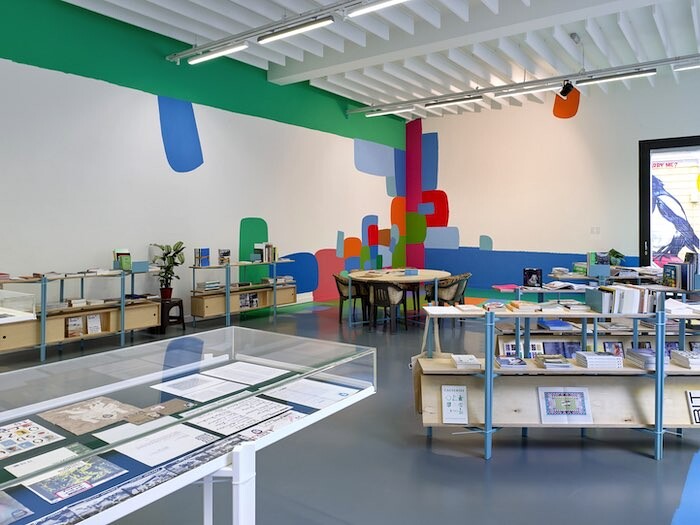 My reading of Hernández Chong Cuy’s program for Witte de With is necessarily influenced by an awareness of this recent past, encounters with various colonial histories repressed and revealed, as well as future perspectives for an institutional change in name. However, between the past and the future there is also a meantime. The opening fall exhibitions are Hernández Chong Cuy’s second act in Witte de With’s new program, which she launched in May. Concise descriptive language is used in exhibition communication and wall texts. The respective missions of Witte de With and TENT are differentiated for the public when they enter the building. The Witte de With director’s office is now visibly located on the shop floor between the galleries, which are designated for the exhibitions they will contain: two for solo exhibitions on the first floor, and an entire space for group exhibitions on the second. Hernández Chong Cuy had the glass-fronted, street-side gallery space re-designed and re-allocated as Untitled. She commissioned Federico Herrero to make the mural Open Envelope (2018), in which soft blocks of bright color flow out from the wall joints and up from the baseboards, and brought in furniture by Studio Manuel Raeder’s Muebles Manuel. Most importantly, Untitled is accessible to the public free of charge. It hosts curated presentations in vitrines, a program-related bookshop, and weekly public gatherings and events that promote collective learning.