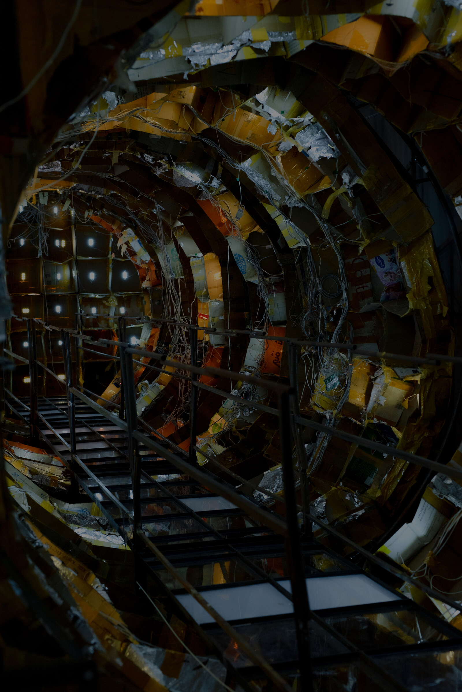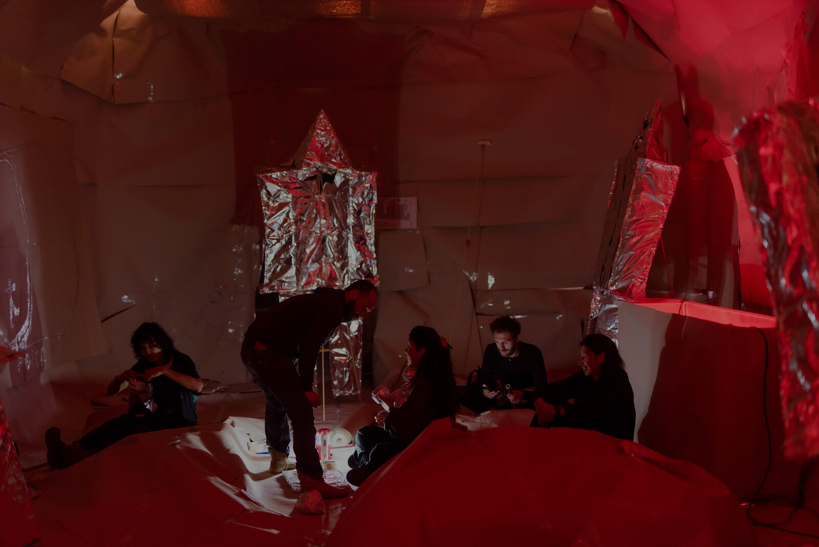 We listened to our guide read a text by Kalmykov to the accompaniment of changing sounds and lights. The aluminum on our heads served as the transmitter, whilst cardboard mantle was a “protector” for the energies the artists wanted us to engage with. The experience culminated in a collective song of worship, in which we called each other’s names and wished for each of us to become the geniuses we deserved to be. Falling somewhere between a religious ritual and a self-help healing group, the ceremony was transformative, conjuring joy and calmness amidst the biennale’s manic opening days.