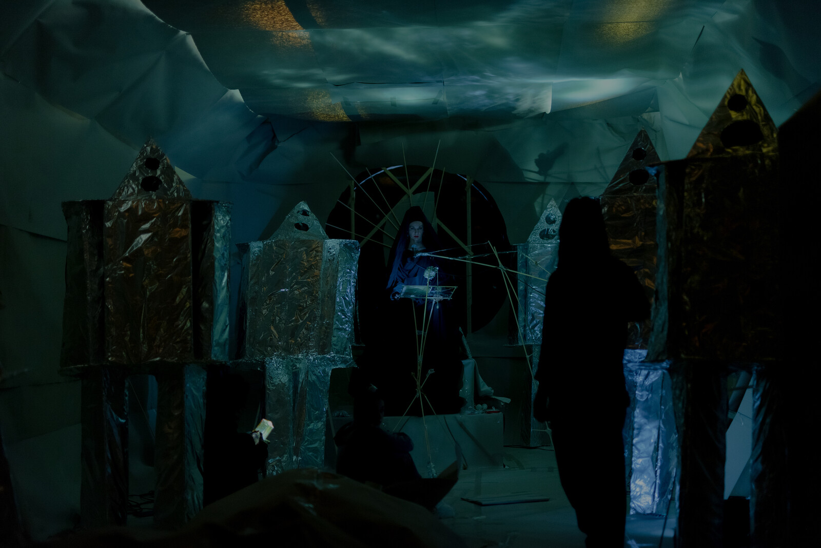 So it was that long scraps of aluminum foil, moving lightly in the breeze, hung over the open doorway to the pavilion during its opening days. After crossing this threshold, visitors were warmly welcomed by a female performer who guided us to read a written precis of the performance that was to follow—a playful yet sincere invitation to spend time in the space, which resembled a DIY spaceship, and take part in a roughly half hour-long performance. The pavilion, called “LAI-PI-CHU-PLEE-LAPA Center for the New Genius,” is the most recent example of ORTA’s longstanding engagement with an artist who was born in Samarkand and educated and employed in St. Petersburg and Moscow, where Kalmykov belonged to the studio of painters Kuzma Petrov-Vodkin and Mstislav Dobuzhinsky.