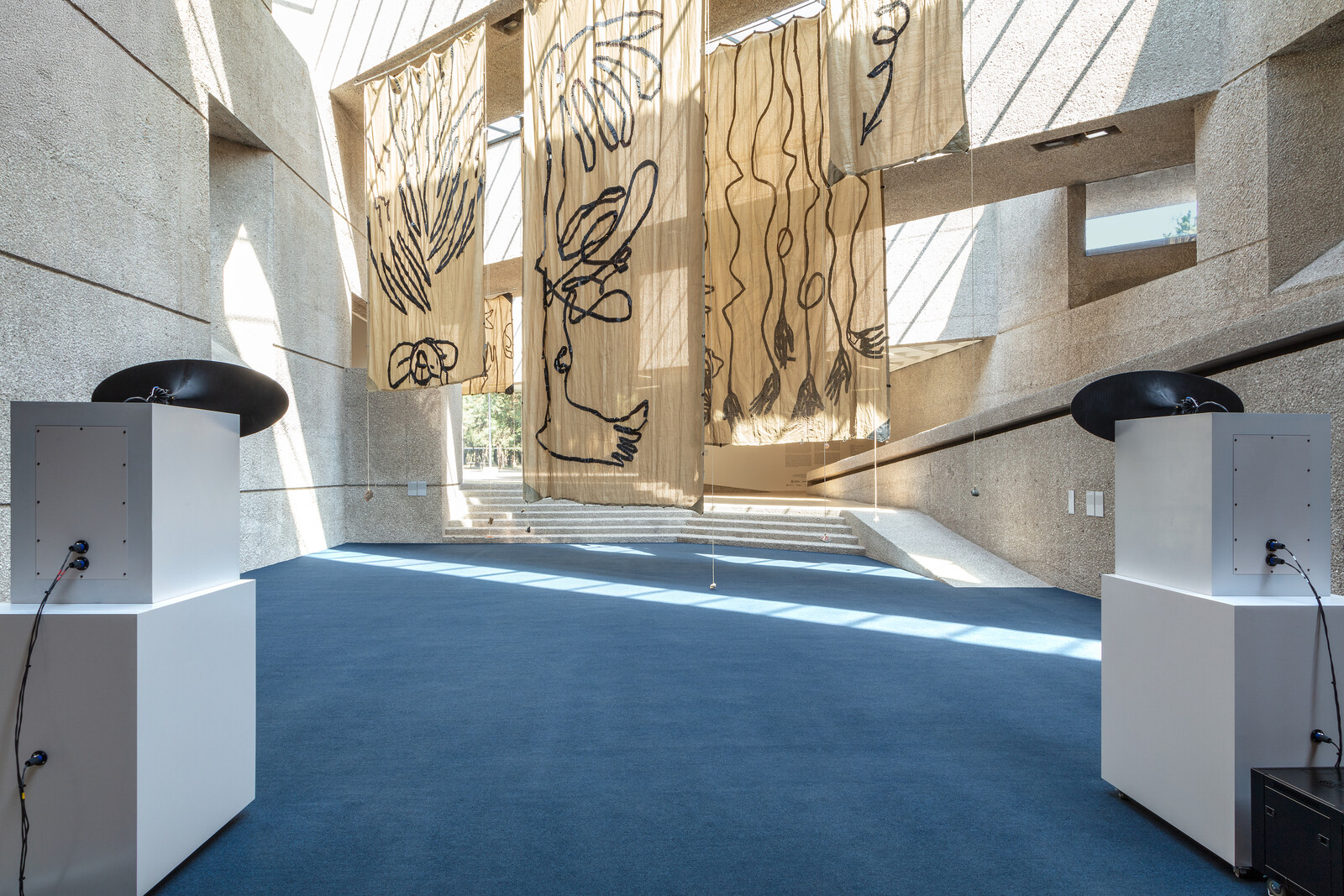The exhibition begins in the central patio, where a MIDI-controlled pianola has been programmed to play Conlon Nancarrow’s Study No. 21 (1948–60)—the piece is notorious for its intense speed and posthuman notation—once every hour. On my visit, however, it wasn’t working. Two sculptural speakers nearby played a combination of music, sounds, and noise selected by three radio collectives: Radio Noche, Radio Nopal, and Radio Imaginario. Abraham González Pacheco’s Windborne Message (2024), a series of beige polyethylene curtains hanging at different heights and embroidered with fists, roses, and scribbles, offered a scenography of sorts. The audio continued throughout the day, interrupted only by five-minute silences during which the Nancarrow should have been playing. It felt indicative of the broader incoherence of this deliberately “cacophonous” show. This empty stage appeared to have been set for a spectacle that left no traces, and which lacked instruments, performers—at times, even an audience.