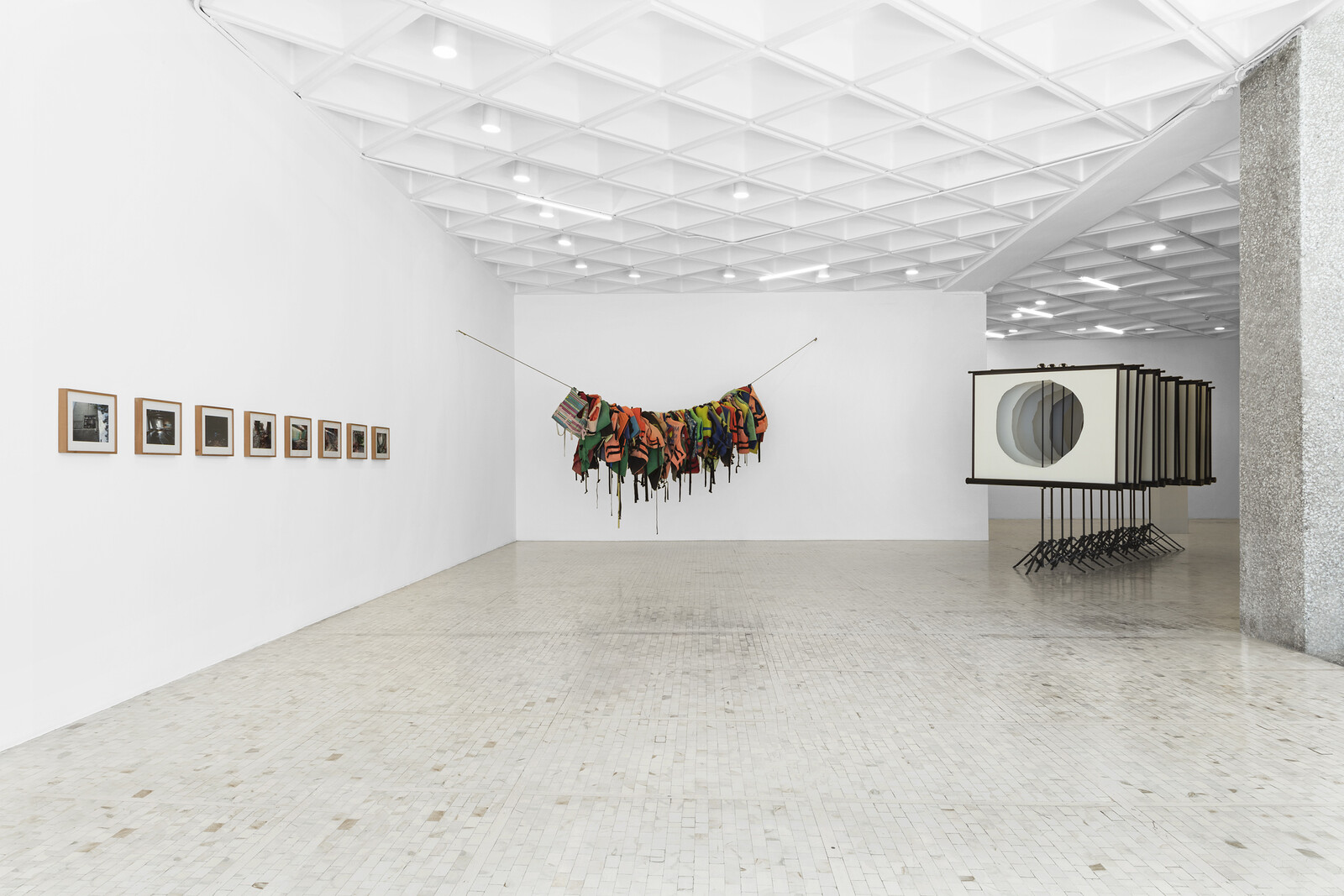 The show’s conceptual looseness is reflected in sections that are almost completely unintelligible: a combination of over-ambitious themes, awkward spatial distribution, and the absence of wall texts limit one’s ability to draw connections between the exhibited pieces.2 Take the large central gallery, “entropy, speculation, and visualization,” which opens with a corner crowded with works by Miguel Calderón. These include a series of photographs of ruins (El balance de las improbabilidades 1, 2, 3, 4, 5, 6, 7, 8, 9, 10, 11 , 12, 13 [The Balance of Improbabilities], 2017), a hanging line of ragged, sun-drenched life-jackets familiar from any Mexican coastal town (Untitled, 2020), and a row of free-standing projector screens with increasingly large holes cut out from them (Pantalla hipnótica 2 [Hypnotic Screen 2], 2020). The juxtaposition of these pieces made me think of Michael Yonan’s “fear of the tchotchke,” the anxiety suffered by art historians who fear they are wasting their attention on insignificant yet overvalued objects. It’s a grouping of works that seems to share nothing but gallery space with Julieta Gil’s digital renderings of feminist protest graffiti on beloved local monuments, Nuestra victoria I-V [Our Victory I-V] (2019–20), or with Josué Mejía’s chuckle-worthy art-political cartoons needling the relationship between Mexican modernism and US corporations, Exposición comprensiva de arte mexicano I-V [Comprehensive exhibition of Mexican art I-V] 2020)—to name just a couple.