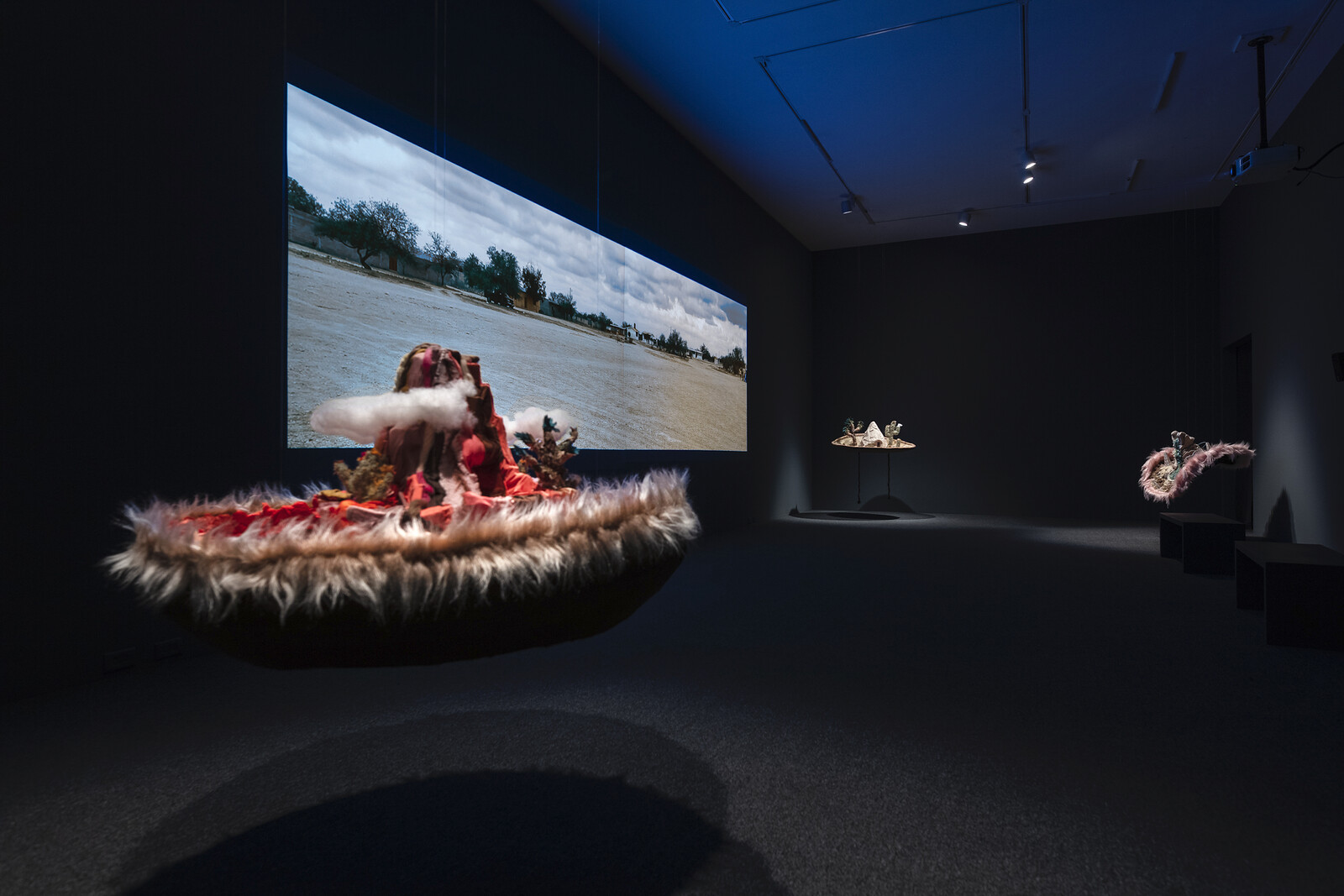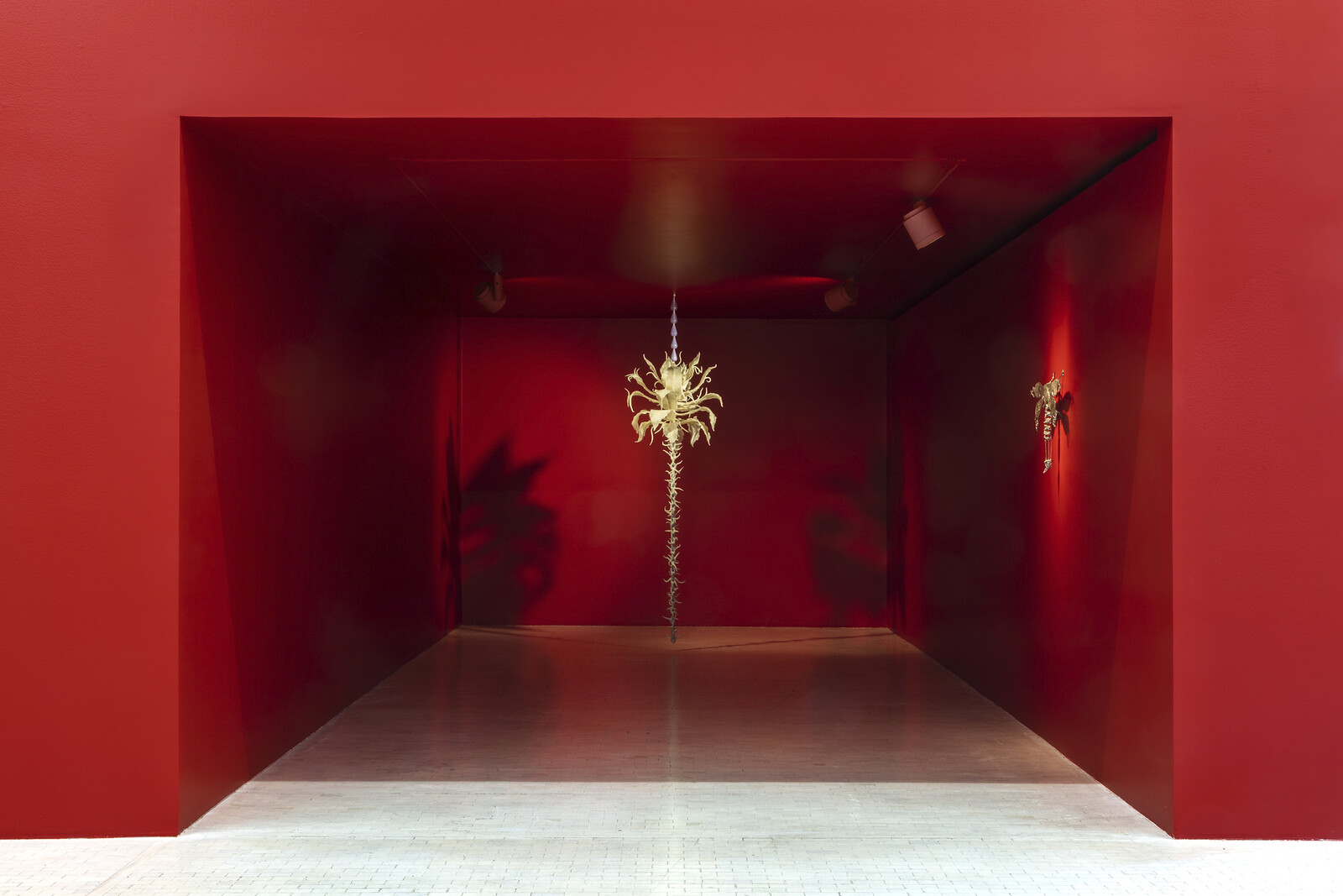 Another highlight arrives in one of the last galleries, oddly and dramatically painted blood red. In a small nook to one side of the space, the artist duo ASMA install Poción Multijugos [Polyjuice Potion] (2020), a delicate totem hanging from the ceiling: a chain covered in paraffin wax and resin sculpted to resemble the thorny stem holding a strange flower, equal parts desert-like and tropical, at once angelic and monstrous. Theatrical lighting projects wispy shadows on both sides of the object; one of these is cast across a wall on which is displayed an eerily beautiful dragonfly, Extraño reflejando mamíferos [Stranger Reflecting Mammals] 2020), into the wings of which is carved a scene depicting human legs in techy footwear meeting a wild canid, a hand reaching out towards its head. The object feels both dug up from somewhere in another future and a relic of a moment that hasn’t yet happened—and maybe never will.