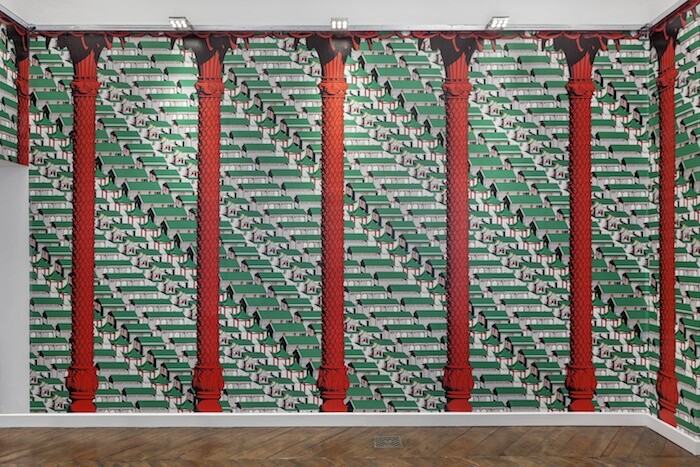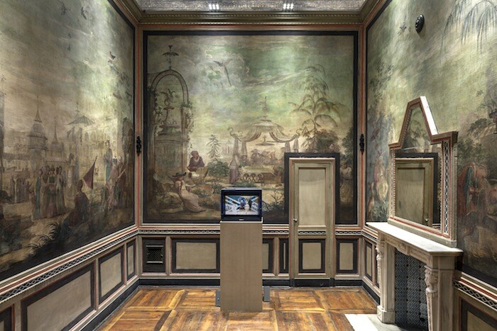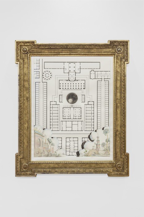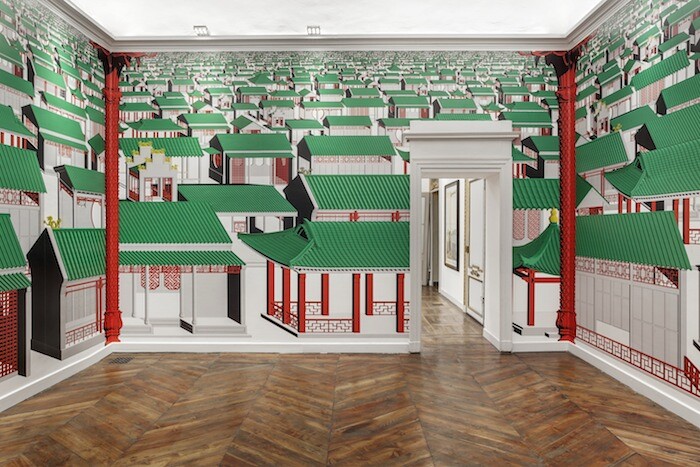 The fashion for Chinese decoration, architecture, and craft in Europe was the first great wave of exoticism in Western culture. It lasted for more than a century, from roughly 1670—when Louis XIV commissioned the Trianon de Porcelaine, a Chinese-inspired architectural folly, for Versailles—to the end of the eighteenth century. It reached manic heights (Augustus the Strong, prince of Saxony, almost drained the state finances to fuel his collection of porcelains), and left an indelible mark on the history of taste (the “English garden” was also born of a desire to imitate Chinese landscape architecture). So it’s surprising that it’s taken Pablo Bronstein, whose oeuvre draws on eighteenth-century architecture and décor, so long to devote an entire exhibition to it. Perhaps the venue persuaded the Argentina-born, London-based artist that the time had come: a wonderful eighteenth-century apartment in the center of Turin, a room of which is still decorated with frescoes in the Chinoiserie style.