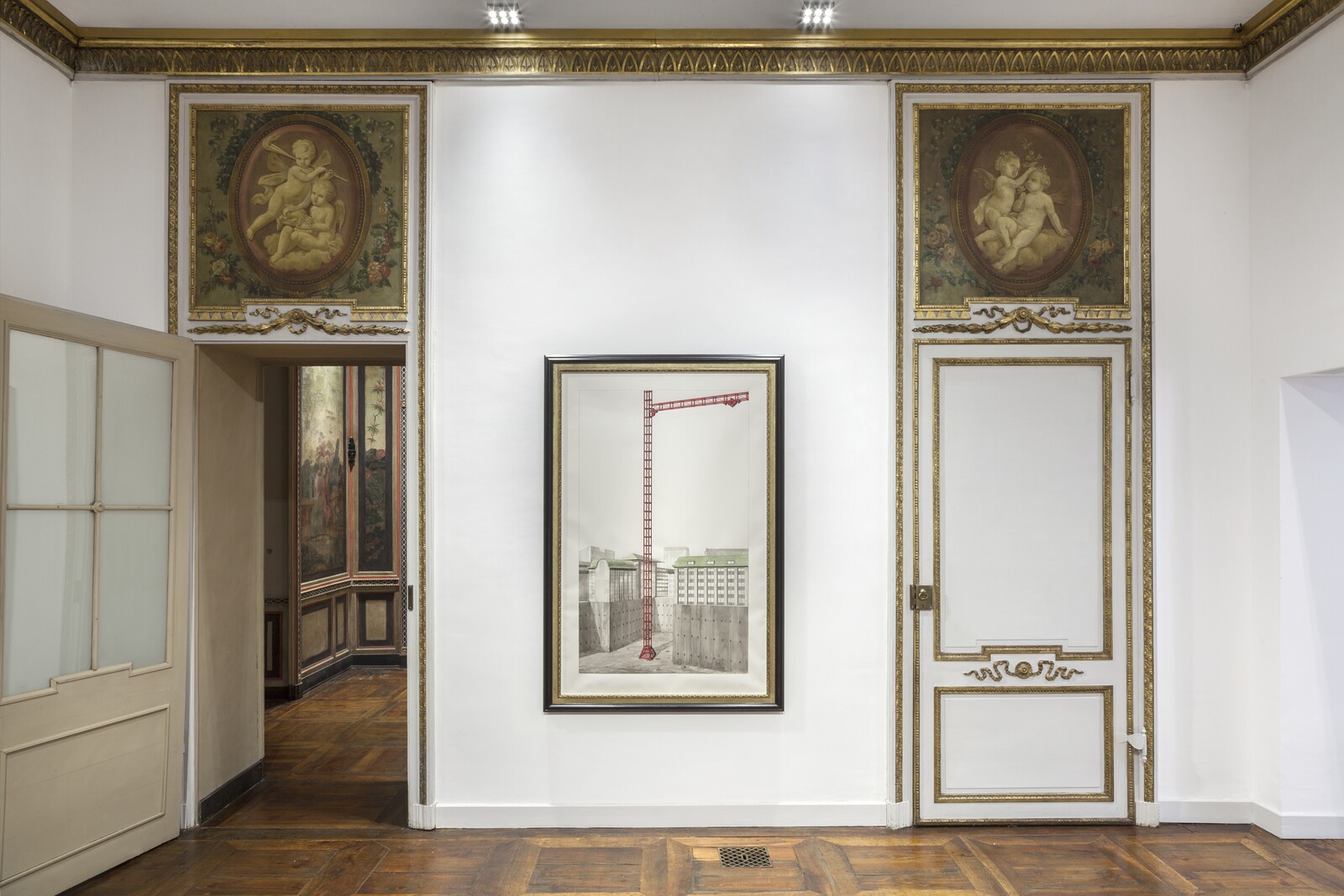 Bronstein doesn’t address this historical background directly, instead examining its echoes in the present. Beneath their eighteenth-century graphic attire, some of the works in the show consider what China stands for in the contemporary Western imagination: mass production, aggressive commercial expansion, frenetic urban development. Take the watercolor Large Crane, for instance, whose subject is not the elegant bird that we might expect in this company but a contemporary construction machine, standing between huge concrete buildings. As a concession to Chinese taste, the crane is painted red and embellished with ornamental elements typically associated with antique Chinese furniture, while the buildings are topped by incongruous rolled-edge roofs. On the same line are the wallpapers with which the artist has dressed three rooms of the apartment. There, the elaborate pavilions and exotic landscapes of the adjacent Chinoiserie room turn into a computer-generated combination of architectural elements—pagoda-like roofs, walls, columns—that saturate the walls: architecture as a disposable, mass-produced commodity, ready to fill any given surface, however large. Seen up close, the “largeness of China” is no less impressive to Westerners in the twenty-first century than in the eighteenth, when it was observed from afar.