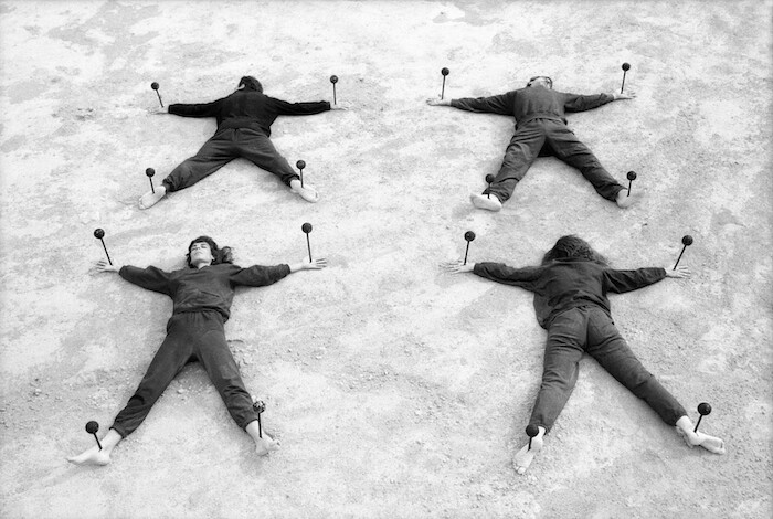 Interestingly, the groupings make no categorical distinction between Latina and Chicana artists—those from Latin American countries and US citizens with Mexican ancestry—liberating Chicana art from the expectation that it should remain faithful to activist stances on inequality, immigration, and feminism. A topic as broad as “the body” takes on laser precision and multiple objectives, moving from the enveloping, primitive affection of Cuban Ana Mendieta’s Corazón de roca con sangre (1975) to Peruvian Teresa Burga, of the influential Arte Nuevo group, whose Autorretrato. Estructura. Informe, 9.6.1972 (1972) is a self-portrait sketched in metadata: electrocardiogram charts, head and profile shots, and official documents. Works by Brazilians Lygia Pape and Celeida Tostes (O ovo, 1967 and Passagem, 1979, respectively), or Argentine Marta Minujin’s La Menesunda (1965)—which included a papier-mâché woman large enough to accommodate passersby in its entrails— and Statue of Liberty lying down (1979)—a proposal for a full-scale replica in recline and within eyesight of the original—creating rudimentary wombs from which to exit at the artist’s or visitor’s discretion.2 By doing so they obliquely undermine patriarchal and authoritarian restraint, presumably to re-emerge under more favorable historical conditions.