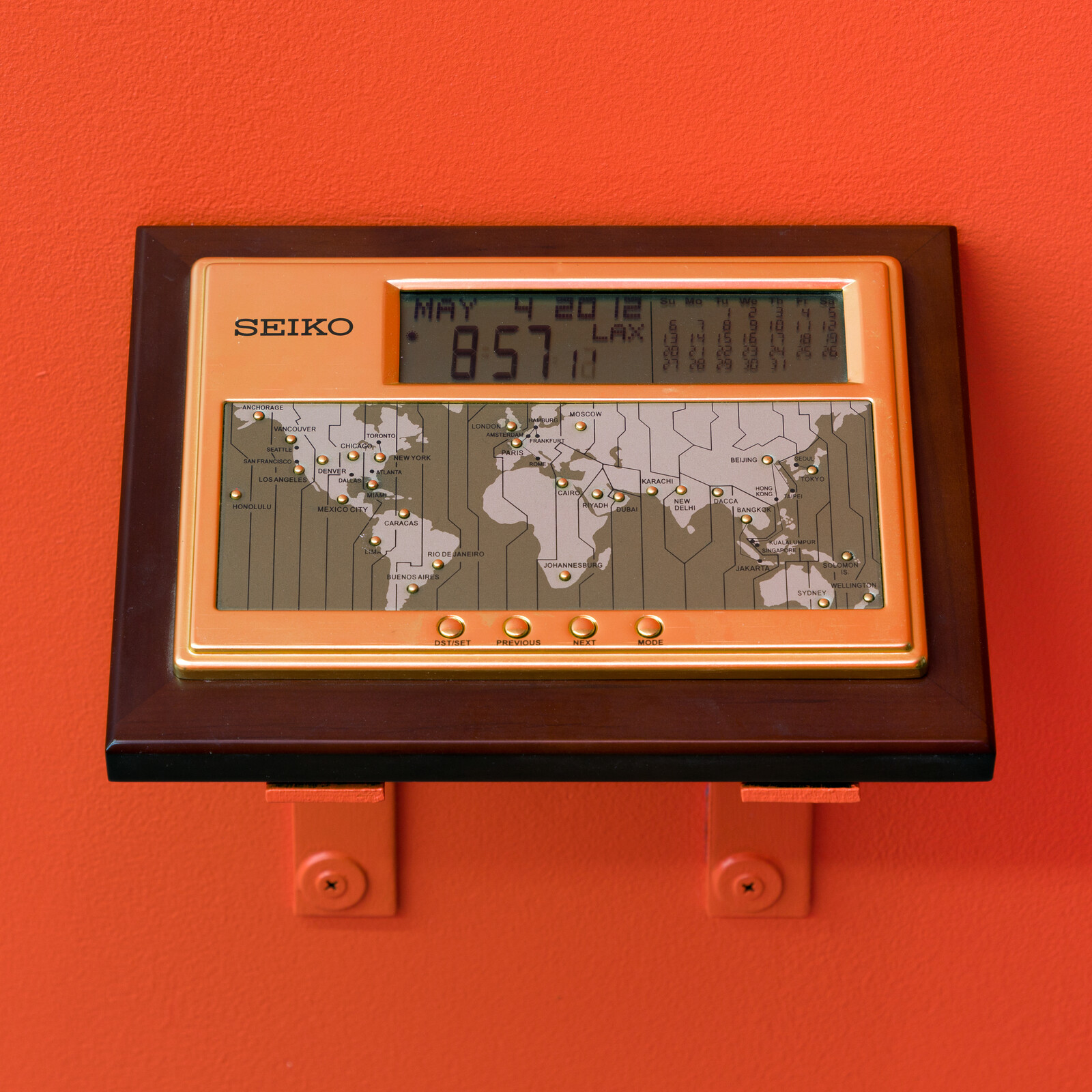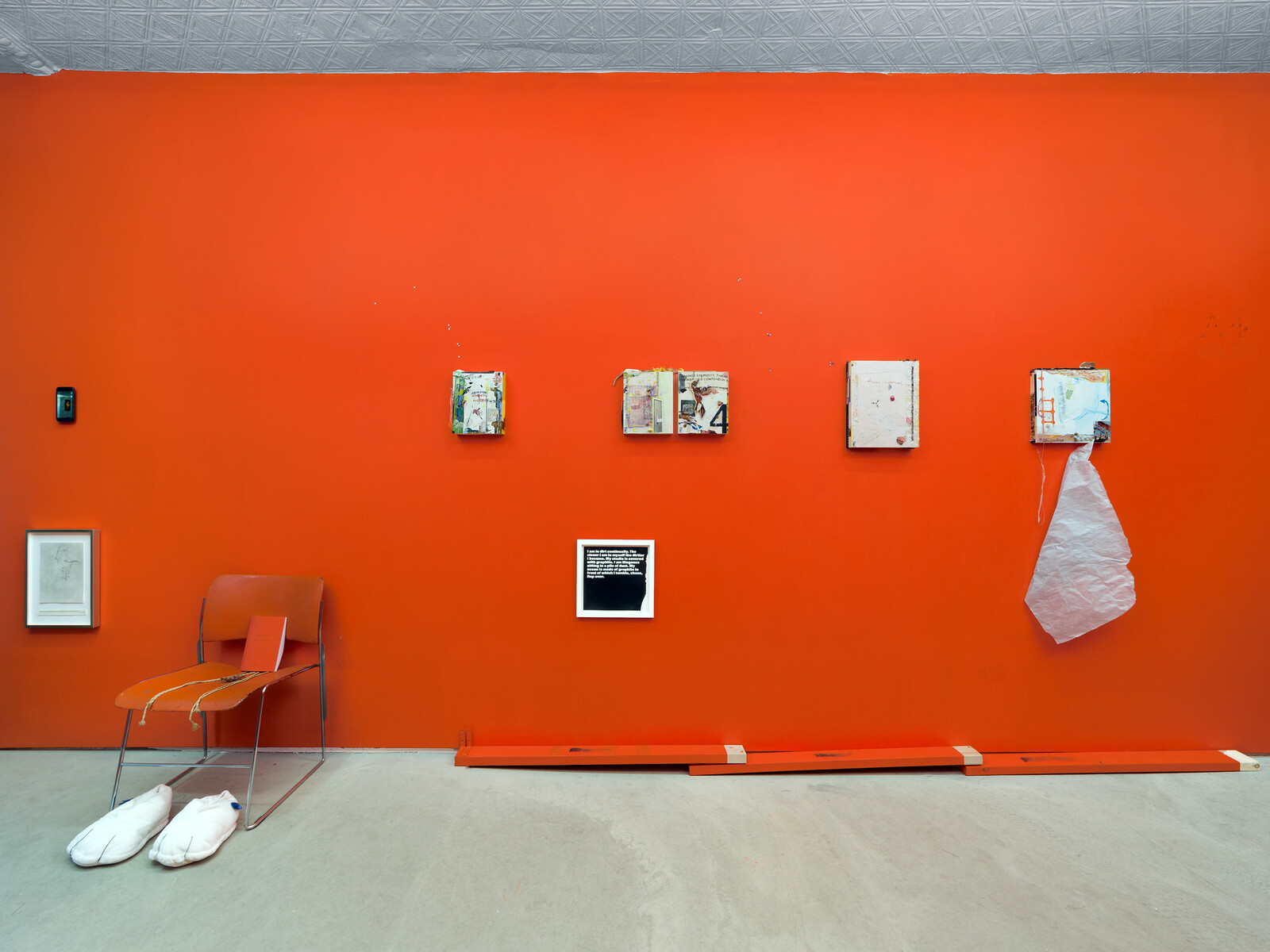 My eye darts around—from a four-by-six snapshot of a mountain (Country Road, Take Me Home…, 2010), to the graphite graffiti of a brick wall drawn onto the wall of the gallery (...Found in The Room That Does Not Care—meanwhile my soul, or value, remains a moving target), to the golden Seiko executive digital timepiece on a shelf by the door (Face Value), set to a different year and longitude. So many visuals, popping against the aggressively cheerful red—but the show is ultimately text-based. I tend to “name” each object—mountain, clock, dog butt—and try to wire them into something coherent. This grasping feeling is the show’s main affect. Nowhere is logically safe, nothing quite makes sense.