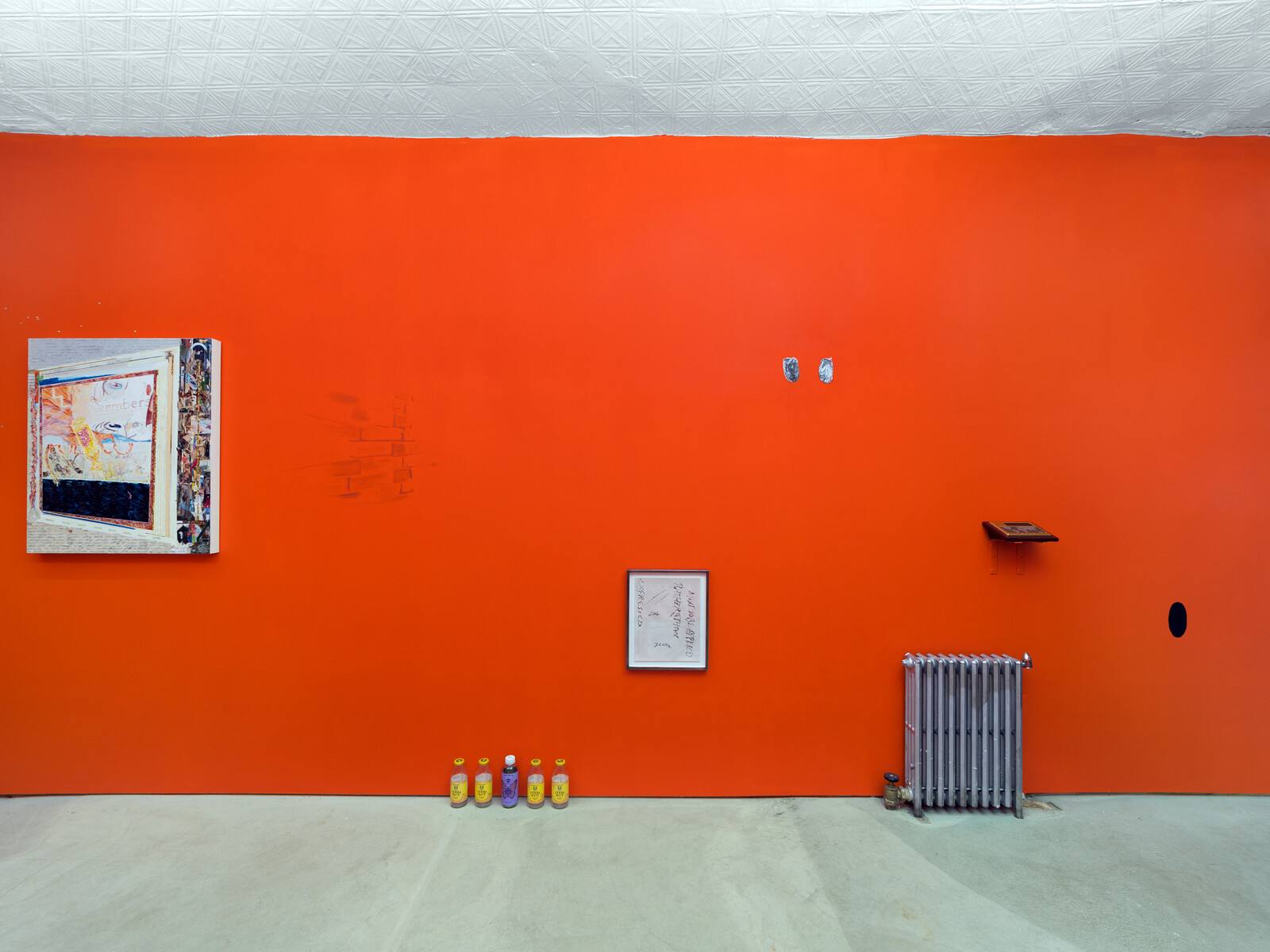 Maybe that’s too much weight to attach to party decorations that never got cleaned up. But why weren’t they cleaned up? Why are they on the checklist, inaccurately, as 99 Red Balloons of Diplomacy (all works 2023 unless otherwise stated): “Thirty-one red balloons,” when some are white? A checklist on a PDF dated May 17—two weeks after the opening? But the balloons fit the vibe. They insinuate themselves into a scenography in which even trash seems resonant. There are partially painted two-by-fours arranged like fallen dominos (a Cold War reference?) along one wall and titled Three Out of Four Bars Agree, a row of yerba mate and kombucha bottles carefully arranged along another (“The historical human is passionate. He or she desires recognition, desires the desire of the other.”). Two crinkled paper ovals, painted gray and stuck to the wall, turn the whole gallery into an unblinking emoji. The latex balloons slumped but the lone mylar globe stayed strong, reflecting the room like a convex security mirror or an Eye of Sauron.