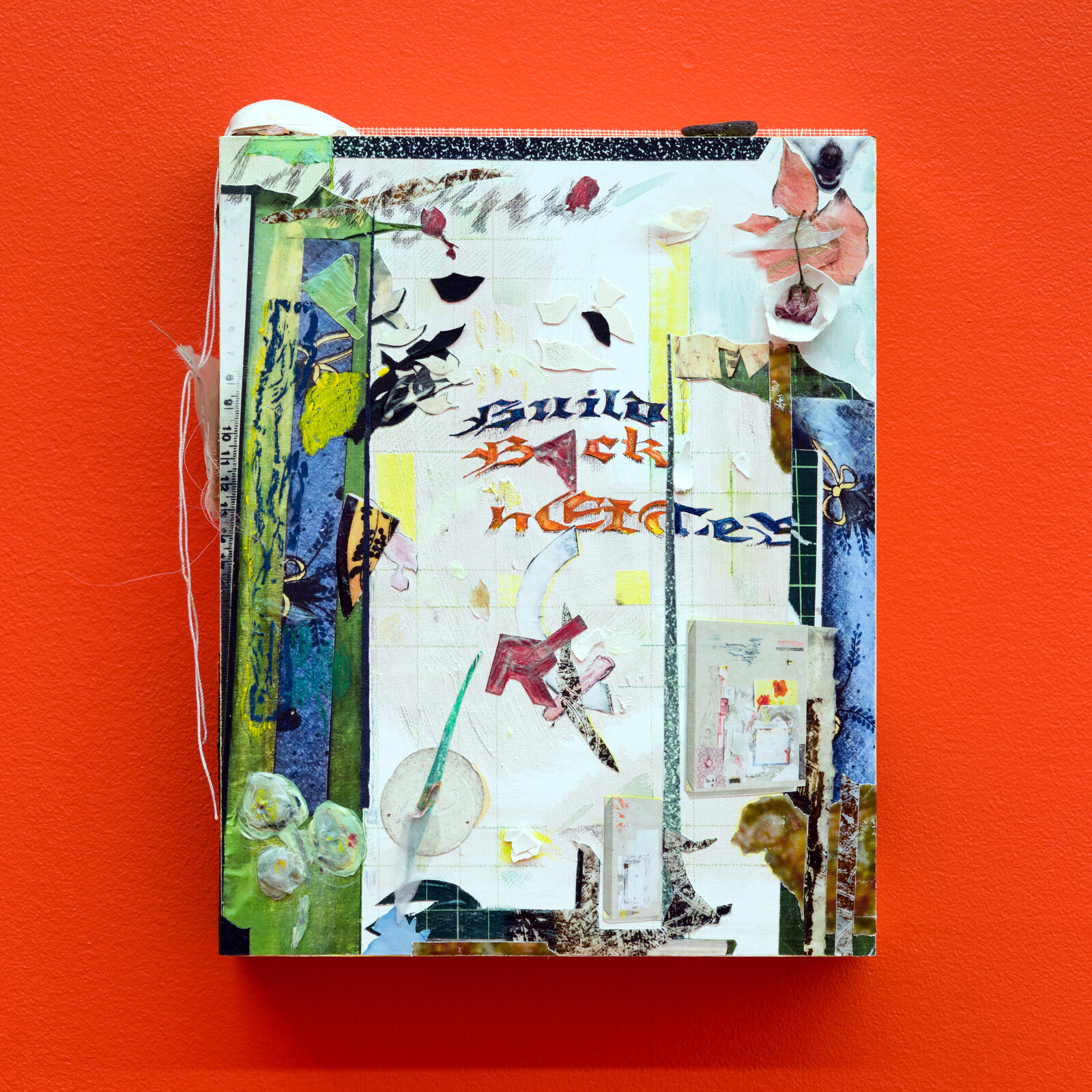 Not even the paintings, the tops delicately lined with fragments of eggshells, snake skin, lace. All but one of the mixed-media works are titled Footnote. Presumably they embellish the larger 2022 painting, you’re finally awake! it’s morning. (Morning in America? A morning meme?) And this painting depicts … another painting, perhaps; one decorating the cover of a book—a slanted image of an anime face, a Sugar Daddy sucker, a dark impasto sea—all canted against a curling, fragmented script. Given the show’s tendencies, this text is probably a long quote, possibly from the artist’s diary. A staticky, dense collage of boutique paper strips runs down the right edge of the wood panel and breaks the illusion. You’re finally awake. Now you can chase the truth, cast around the walls painted Tangerine Tango, Pantone’s color of the year in 2012—another year the world was supposed to end but didn’t.