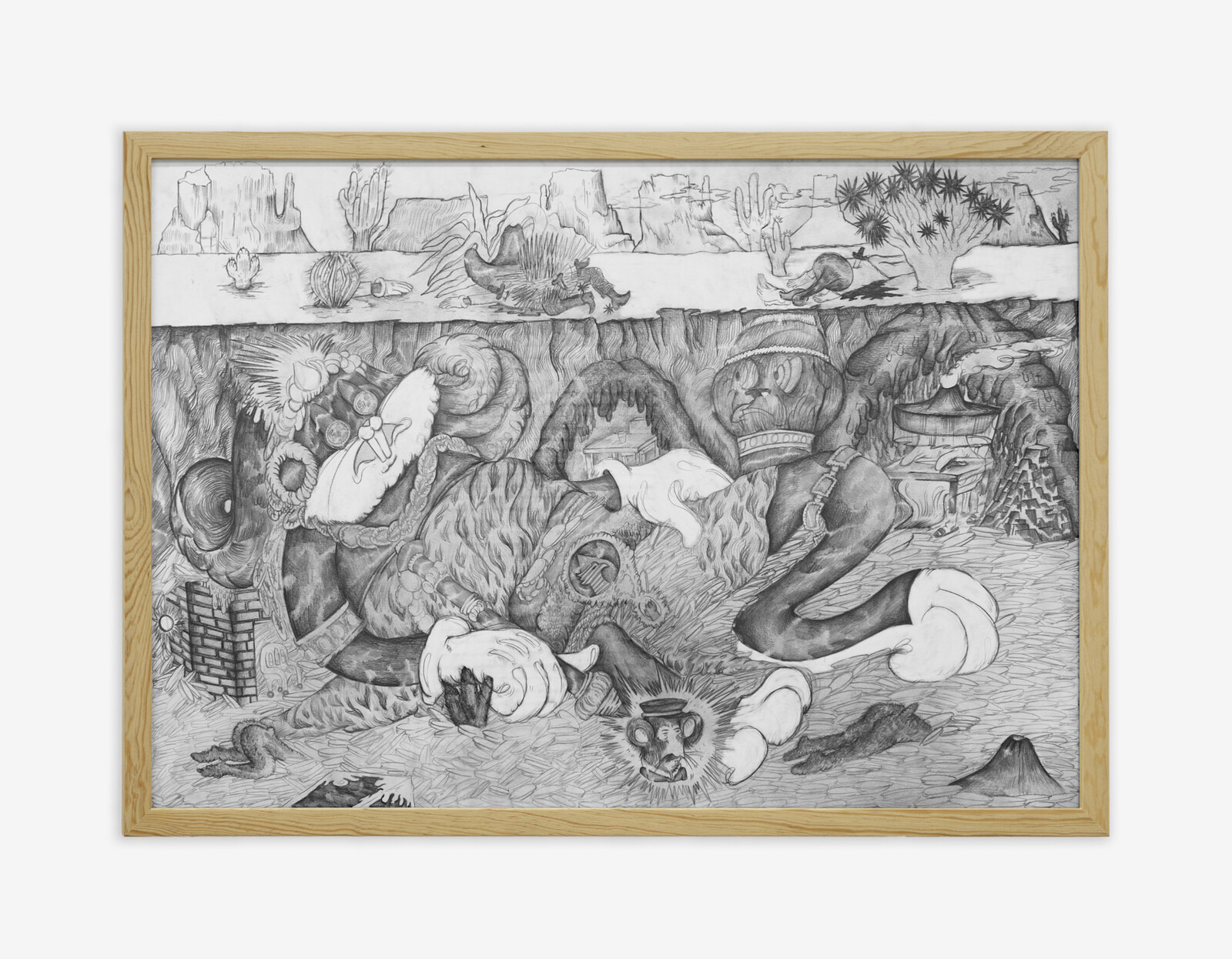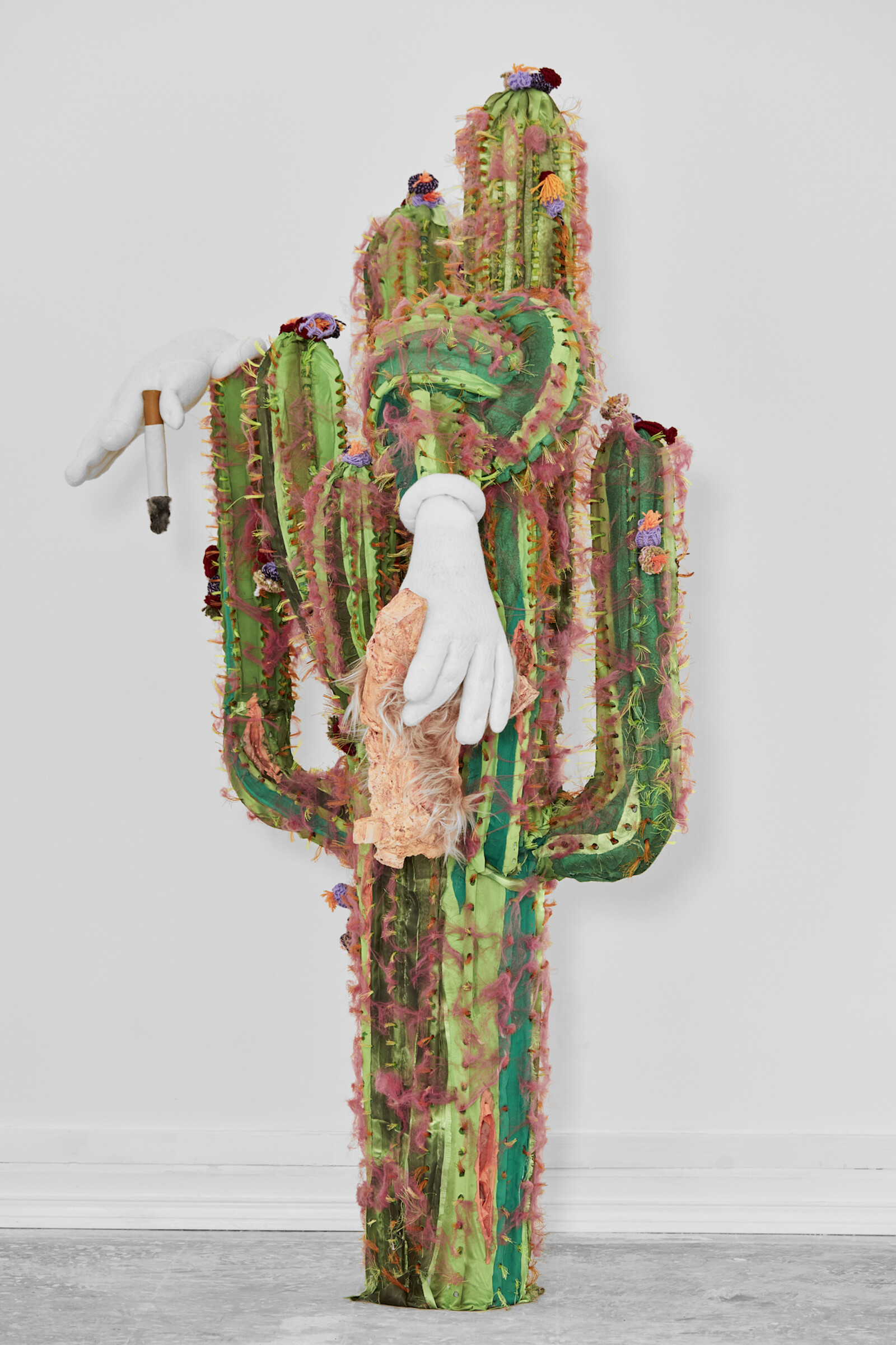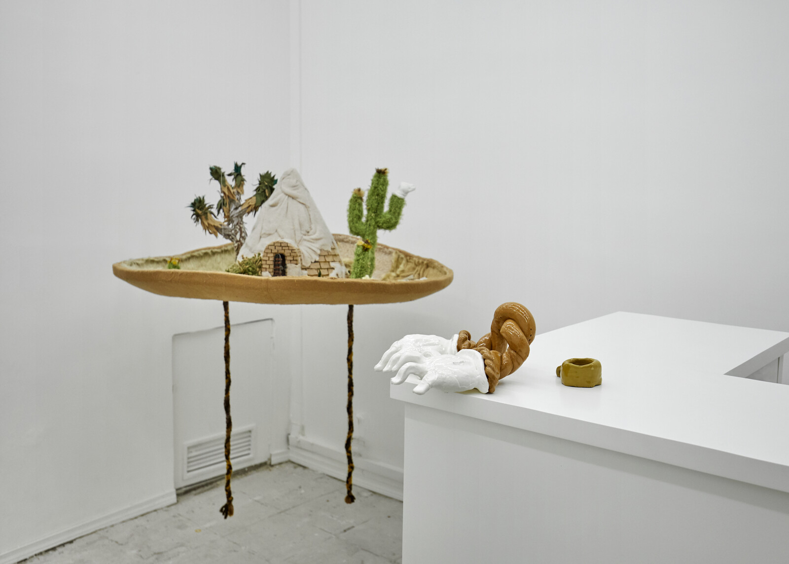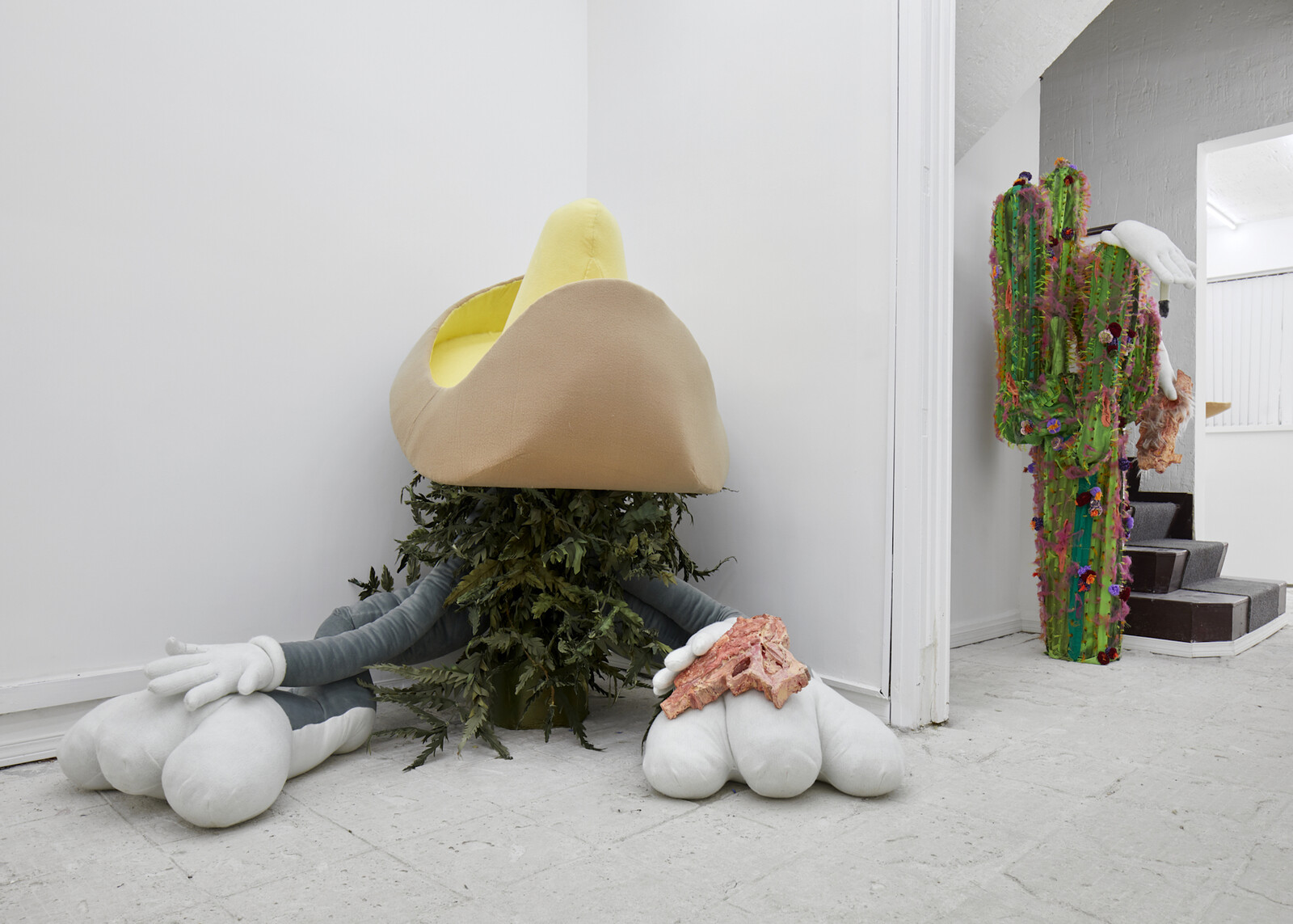 A series of soft sculptures reimagine the desert’s cast of characters through the muddling lens of displaced representation. Quentin Saguarantino, un thriller is a fluffy, piñata-colored saguaro cactus, brandishing a fleshy gun and an oversized cigarette in Mickey Mouse-style gloves. A giant, stuffed Bugs Bunny in ¿Estamos, Kimosabe? is overtaken by the desert brush, only his legs and arms visible under a massive sombrero as he naps against a gallery wall, all the while keeping a firm grip on his gun. Both Cimarrón and Sergio Leone asesina a la Conasupo are hat-sculptures in the shape of hills and cacti, which visitors can try on, thus literally assuming a physical history of atrocity and dispossession. As she interrogates the impact of mass media and the corporate interests behind predatory operations like the United States-Mexico-Canada Agreement, Conteras Lomas represents the Mexican landscape as a house haunted by the victims of capitalism. This, she suggests, is the reality in which we—chilangas and norteños, artists and their subjects—are all trapped.