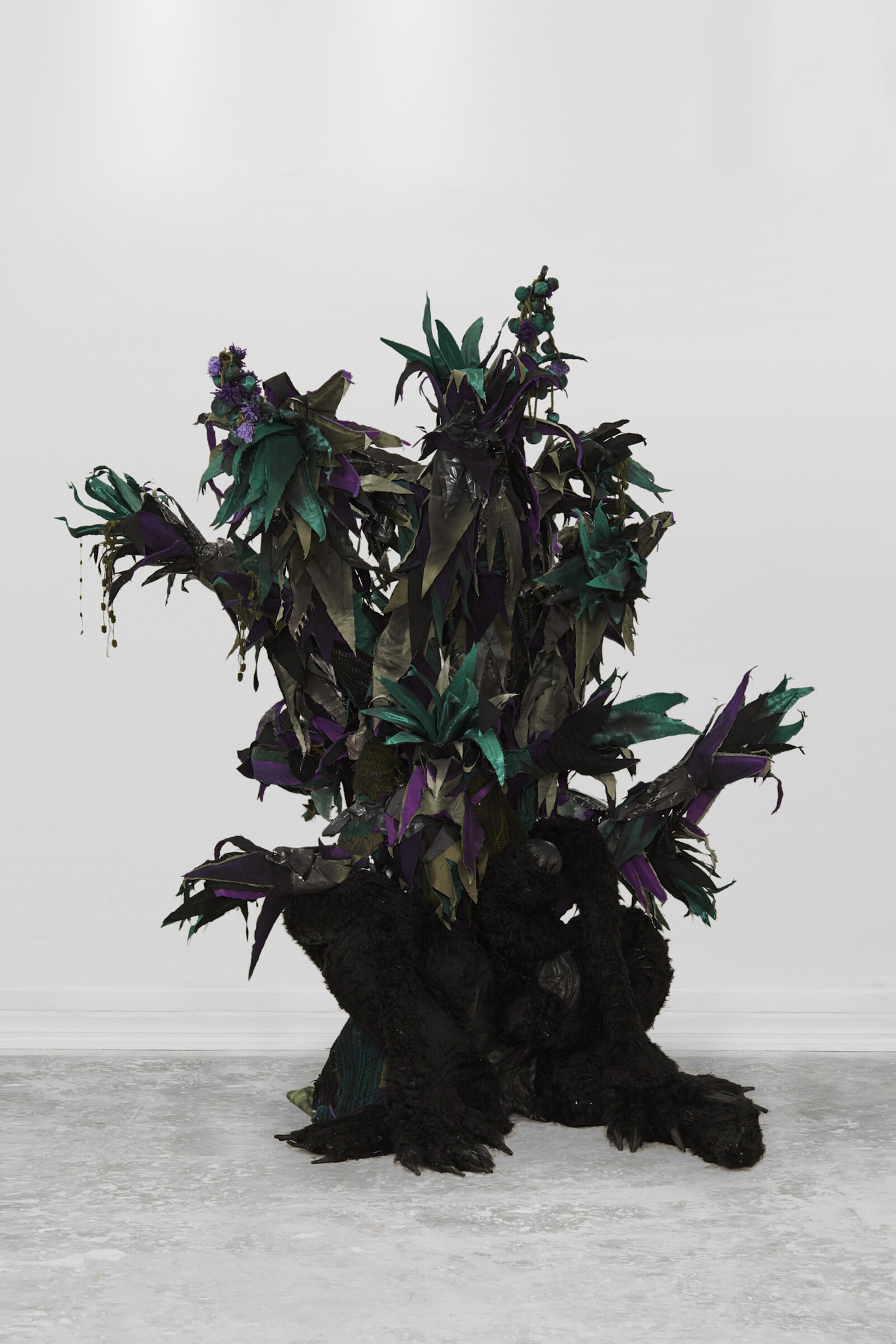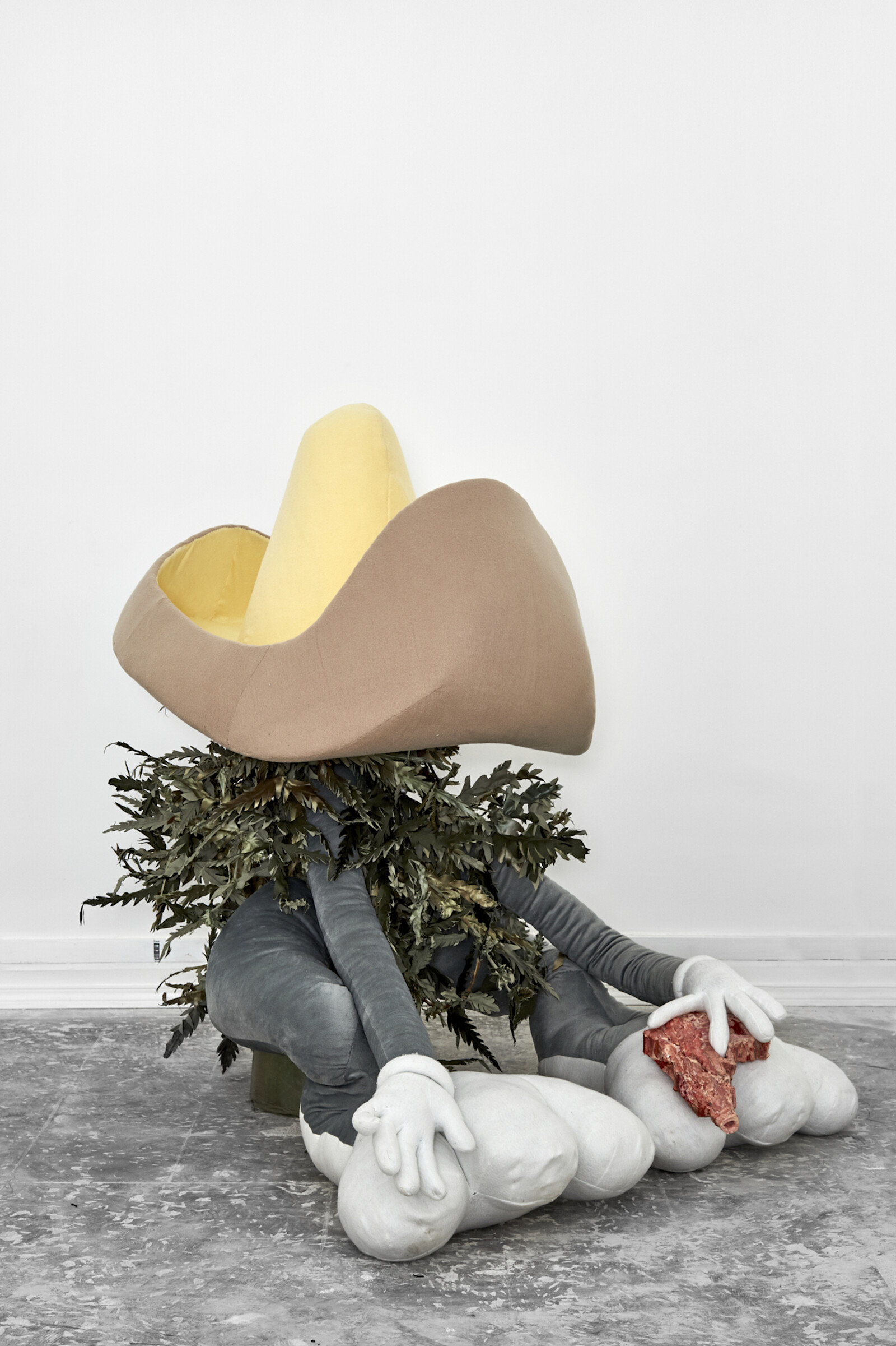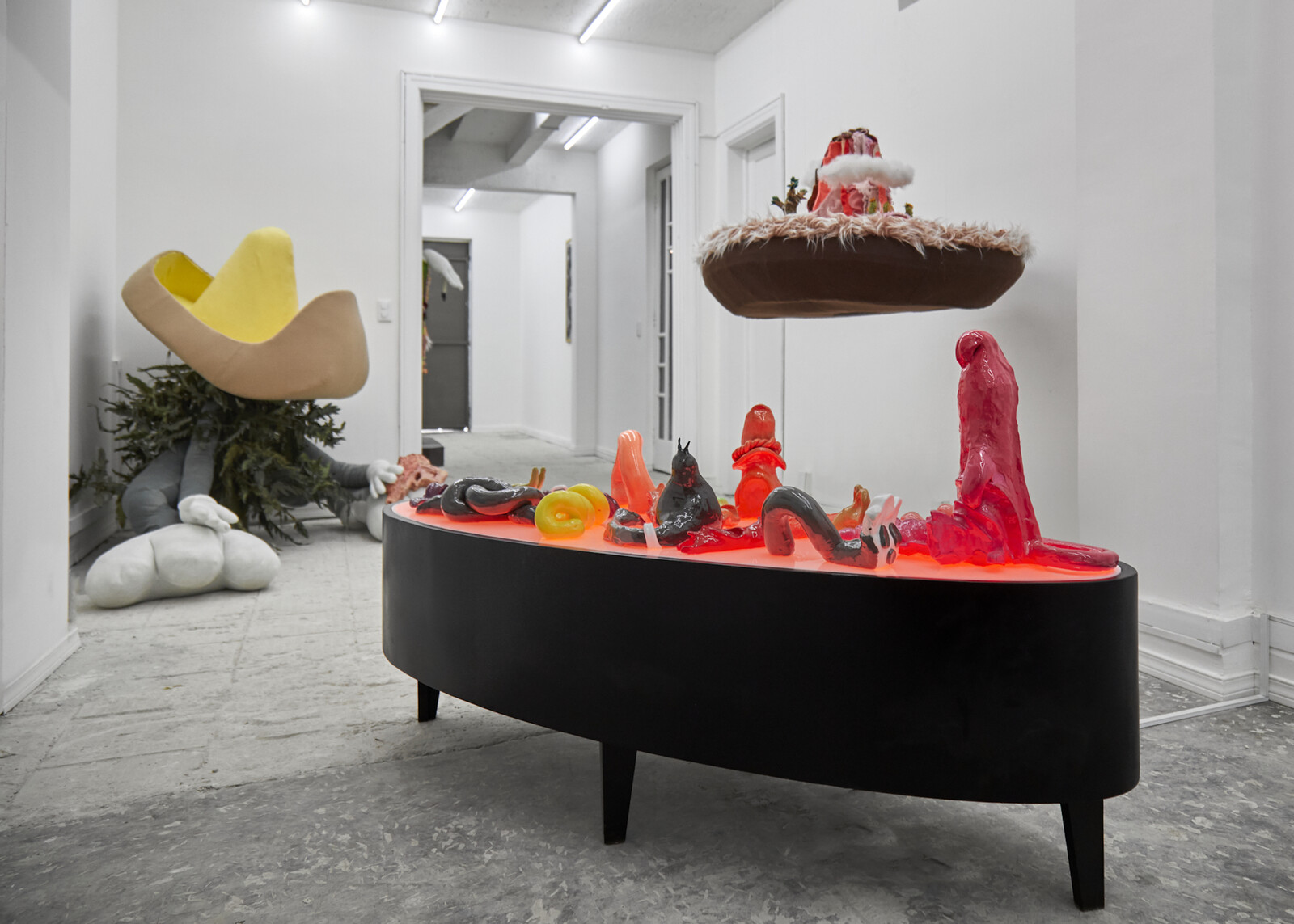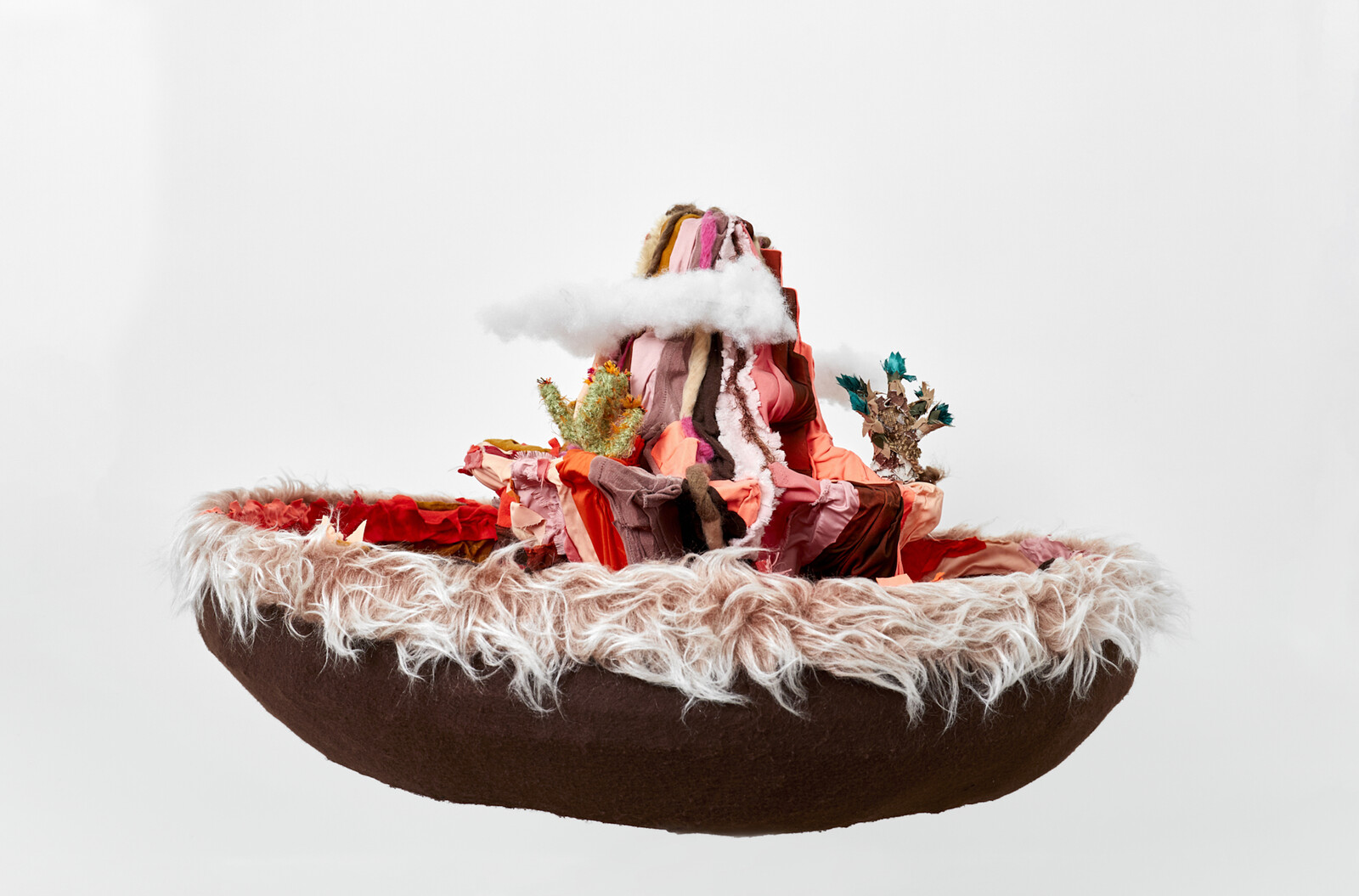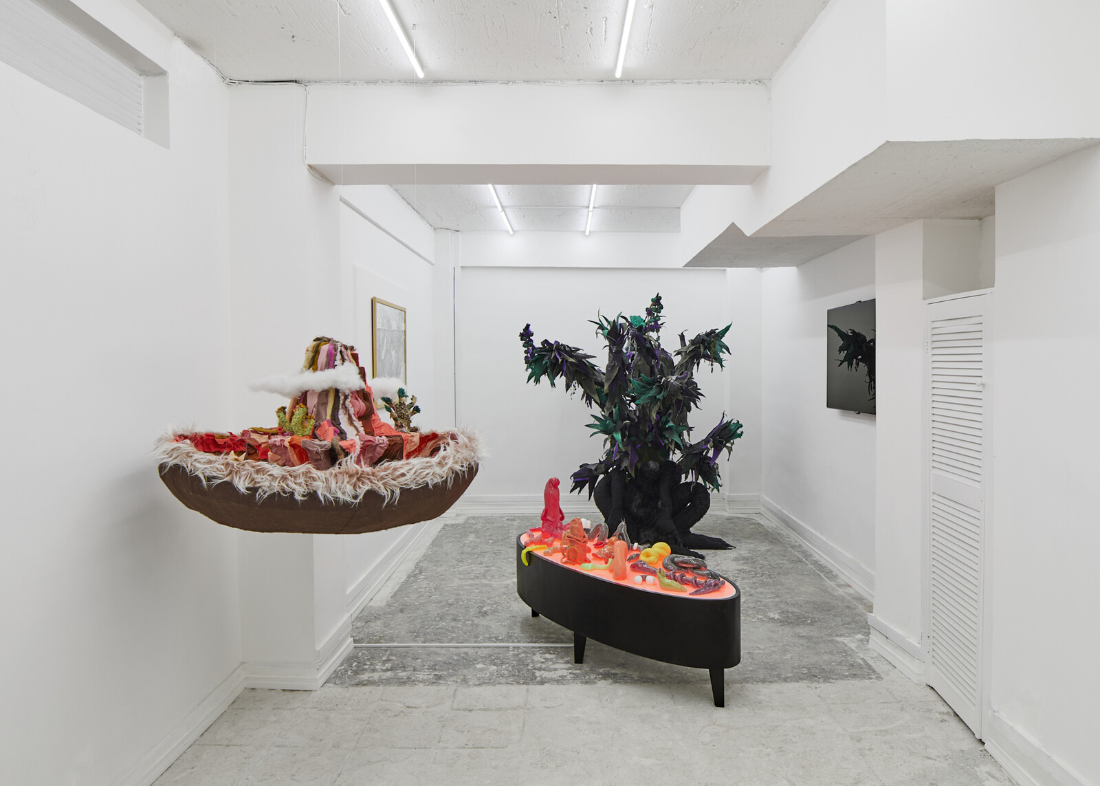 A series of soft sculptures reimagine the desert’s cast of characters through the muddling lens of displaced representation. Quentin Saguarantino, un thriller is a fluffy, piñata-colored saguaro cactus, brandishing a fleshy gun and an oversized cigarette in Mickey Mouse-style gloves. A giant, stuffed Bugs Bunny in ¿Estamos, Kimosabe? is overtaken by the desert brush, only his legs and arms visible under a massive sombrero as he naps against a gallery wall, all the while keeping a firm grip on his gun. Both Cimarrón and Sergio Leone asesina a la Conasupo are hat-sculptures in the shape of hills and cacti, which visitors can try on, thus literally assuming a physical history of atrocity and dispossession. As she interrogates the impact of mass media and the corporate interests behind predatory operations like the United States-Mexico-Canada Agreement, Conteras Lomas represents the Mexican landscape as a house haunted by the victims of capitalism. This, she suggests, is the reality in which we—chilangas and norteños, artists and their subjects—are all trapped.