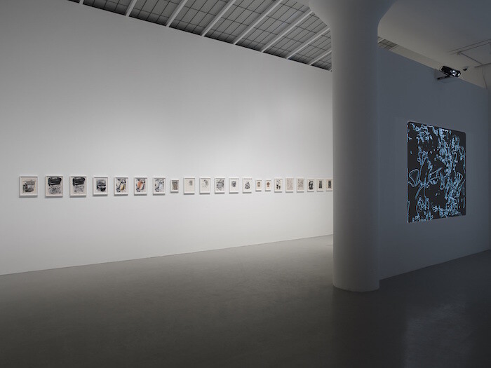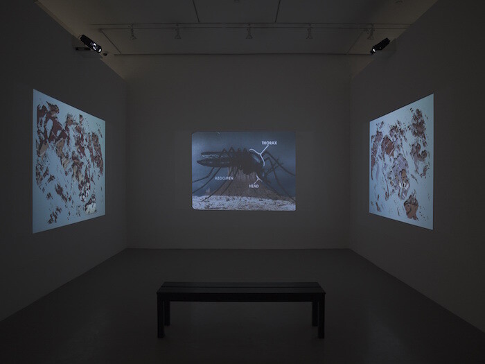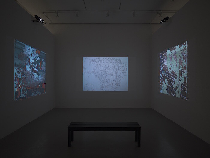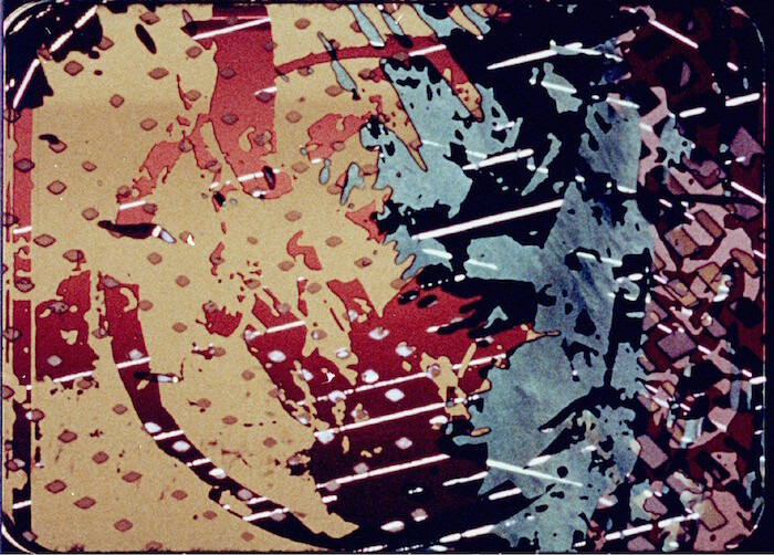 This obsession with the tensions generated by materials and methods has long made his moving-image pieces difficult to read, even as his extraordinarily detailed work with the cinematic apparatus impresses. (It has also enabled him to work occasionally in the commercial film industry, providing optical effects for feature films as diverse as Sweet Sweetback’s Baadasssss Song and The Empire Strikes Back.) In the exhibition’s title work, the silent three-screen projection Let’s Make a Sandwich (1978-2015), O’Neill constantly layers and montages images and textures in surprising, hallucinogenic, and humorous ways. The “sandwich” of the title seems to pun on the many strata of diverse images O’Neill assembles here: images of concrete being poured, step-printed nature footage, and great swathes of abstraction. Splashes of blue and red obscure images of water and black-and-white instructional films in ways that are palimpsestic, often reminiscent of the add-and-subtract strategies of Lettrist décollage.
