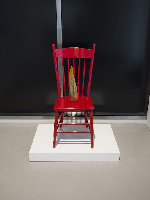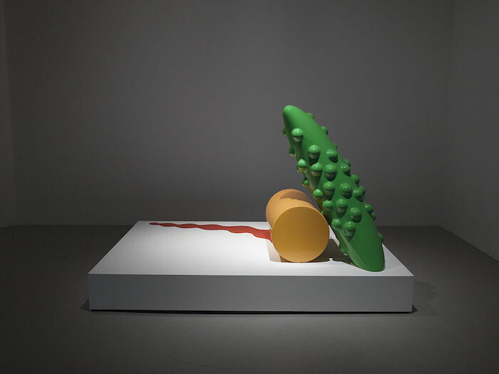 Comprising twenty-two works on paper, five sculptures, and three moving-image works, “Let’s Make a Sandwich” exhibits both O’Neill’s playful sense of humor and his fascination with diverse materials, images, textures, and technical processes. The visitor most familiar with O’Neill’s film work will recognize his sensibility in the other media immediately, as in the exhibition’s first object: the 2001 sculpture Forney Chair, a red wooden chair with a yellow lacquered cow horn affixed to its seat. Simple as it may be, the piece concisely summarizes all of the hallmarks of O’Neill’s work: bright color, shocking juxtaposition of elements, precise craftsmanship, and a curious tension between found and fabricated materials (other sculptures make use of fur, metal, plastic, and wood). A little further into the exhibition’s somewhat labyrinthine space is Safer than Springtime (1964), a fiberglass, aluminum, and steel sculpture composed of three items: a comically large and phallic green pickle leaning against a yellow-gold cylinder with what looks like a trickle of red liquid seeping from its underside.