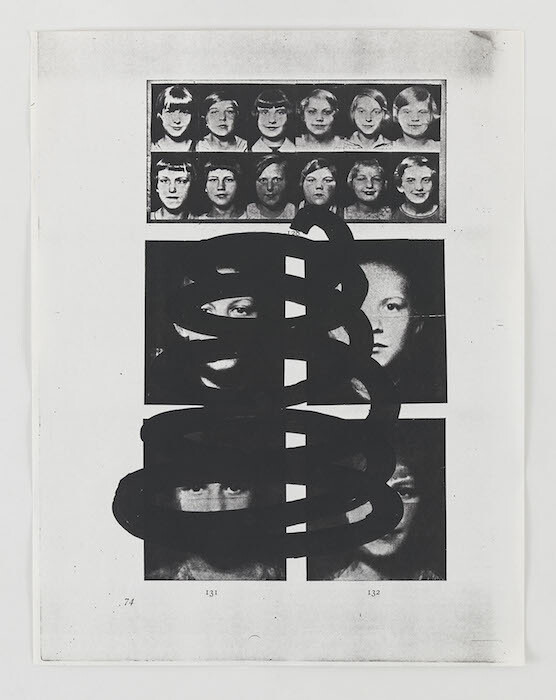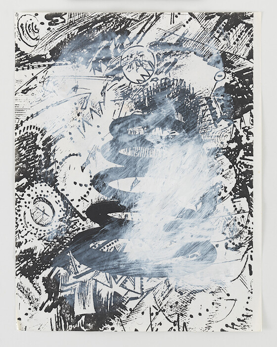 O’Neill’s collages suggest how his approach contrasts with that of someone like Bruce Conner, a roughly contemporary LA-based artist who worked extensively with both film and sculpture. While Conner’s collage works make use of woodcuts and other imagery to sustain seamless illusionistic dreamscapes, O’Neill’s are messy, making visible their various processes of xerography, Scotch-taping, and erasure. The result—as in a handful of works on paper that bear the title The Deadly Spiral (1978)—resists a sense of uncanny immersion, favoring an awkward harmony that reveals the push-and-pull between O’Neill’s handmade and machinic processes.