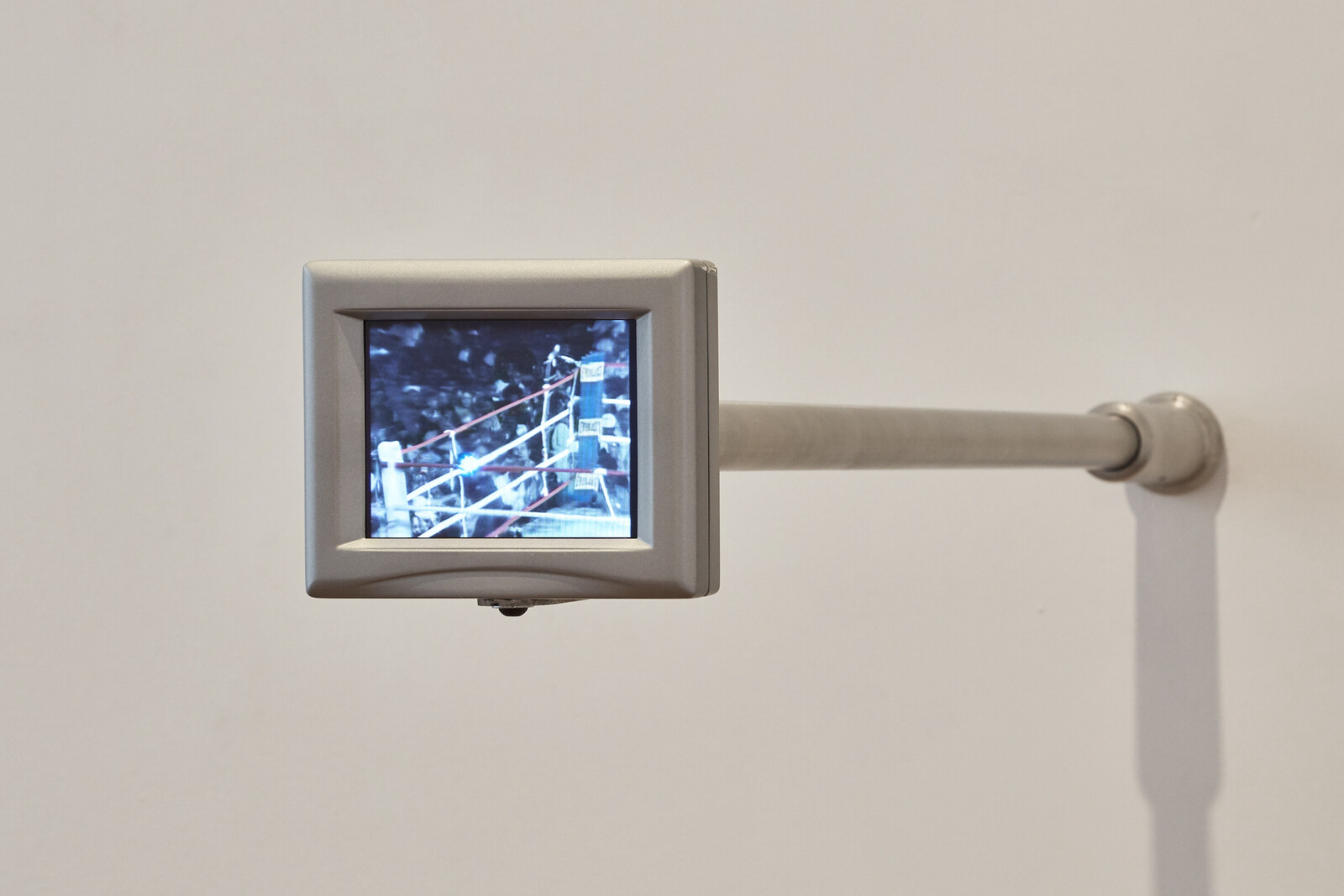 Here is the fulcrum on which Pfeiffer’s practice teeters, and from which it extracts maximum delight. He transformed video art during analogue television’s last gasp—most countries transitioned to digital broadcasts by the late 2000s—and the early works hang perfectly in that balance: he transmuted TV into pixels, but still anchored his output in objecthood. Among the videos on view in “Prologue…,” it’s rare to see a screen or projector treated as an extrinsic element, neutral or of no consequence. The majority are displayed on lilliputian LCD monitors and pre-smartphone personal devices. Race Riot (2001), a four-second loop of an NBA player curled up on the court floor—one among many auguries of the GIF—plays on the 2.5-inch fold-out screen of a late-nineties Sony Handycam.