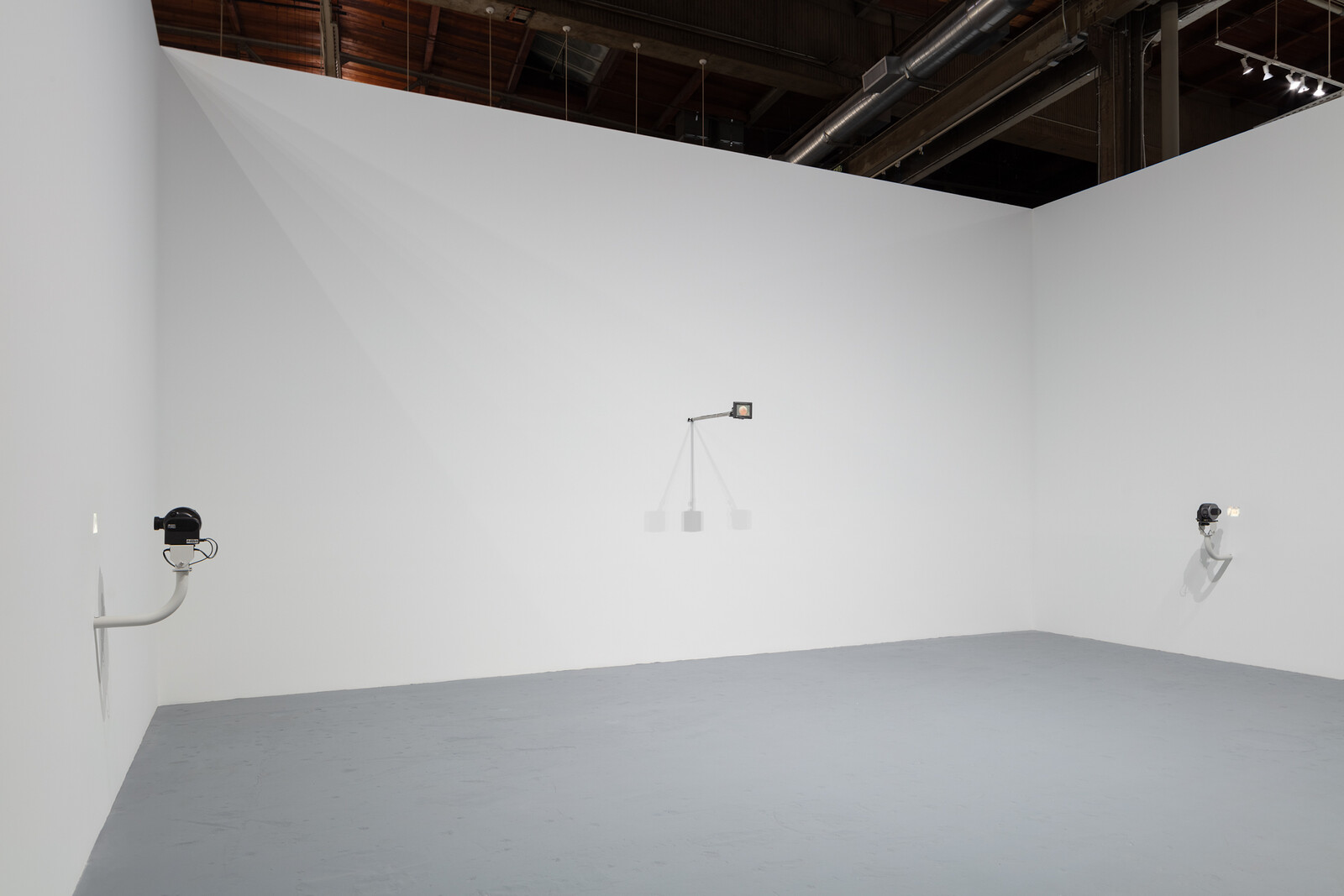 Thankfully, “Prologue…” does not allow these miniature media works to be dwarfed by Pfeiffer’s larger installations, and grants them the precedence they deserve. In the exhibition’s first room, three stand alone: on opposing walls, two consumer-grade Sony projectors, circa 1996, are mounted to security-cam arms, each pointing inward. At such a short distance, the projected works flicker at only a few inches across. The Pure Products Go Crazy (1998) shows a tiny Tom Cruise in Risky Business (1983), quivering ad infinitum on a couch; Fragment of a Crucifixion (After Francis Bacon) (1999) replays broadcast footage of a black NBA player in a white jersey, hands clenched, hollering in apparent triumph. Pfeiffer has removed all markings from his jersey and excised all other players; the man paces alone on his Platonic court. Watched on loop, his open-mouthed scream molders into Baconian agony. Between these two is John 3:16 (2000), a 5.6-inch LCD monitor attached to a straight metal arm. For a couple of minutes, an orange basketball remains center-frame, sewn into a single entity from countless clips, a comet streaking across televised time.