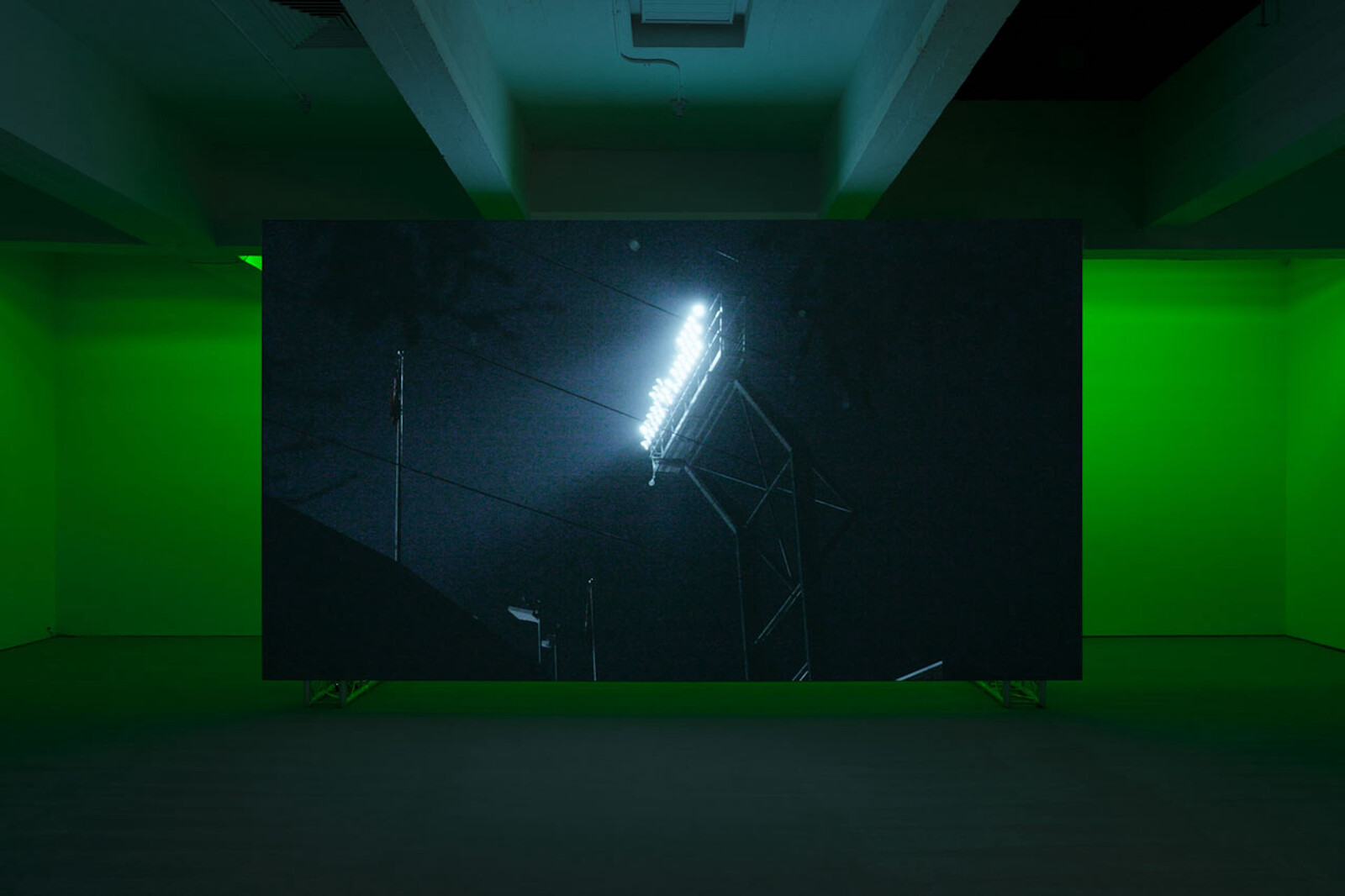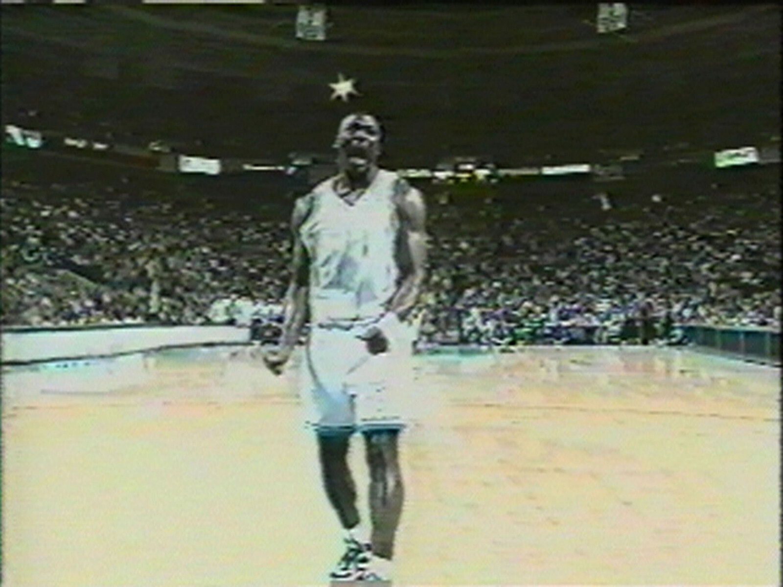 “I think it’s an almost perfect match, TV and sports,” the media theorist Neil Postman once mused. “There’s almost no content… it’s all form, all dynamic imagery.”2 Pfeiffer clearly takes pleasure in the telegenic power of professional basketball, soccer, hockey, football, and boxing, but he also knows how to pull the thread of their politics. His low-resolution and Beckettian loops accentuate the motions of athletes’ (mostly Black) bodies, sweating and fighting before amorphous, madding crowds. Even when the athletes have been removed, the dialectic is distinct. (“Birth of freedom,” after all, echoes an emancipatory promise made by Abraham Lincoln during the Gettysburg Address, and “prologue” suggests that it has yet to be fulfilled.)