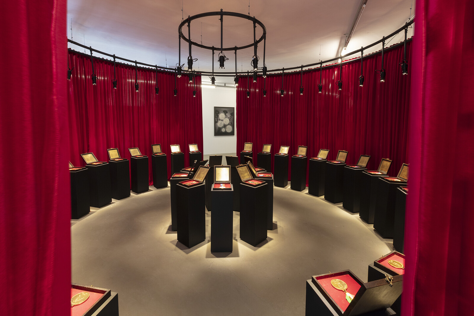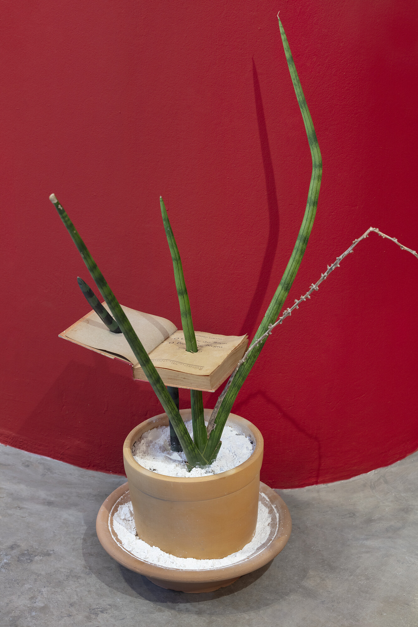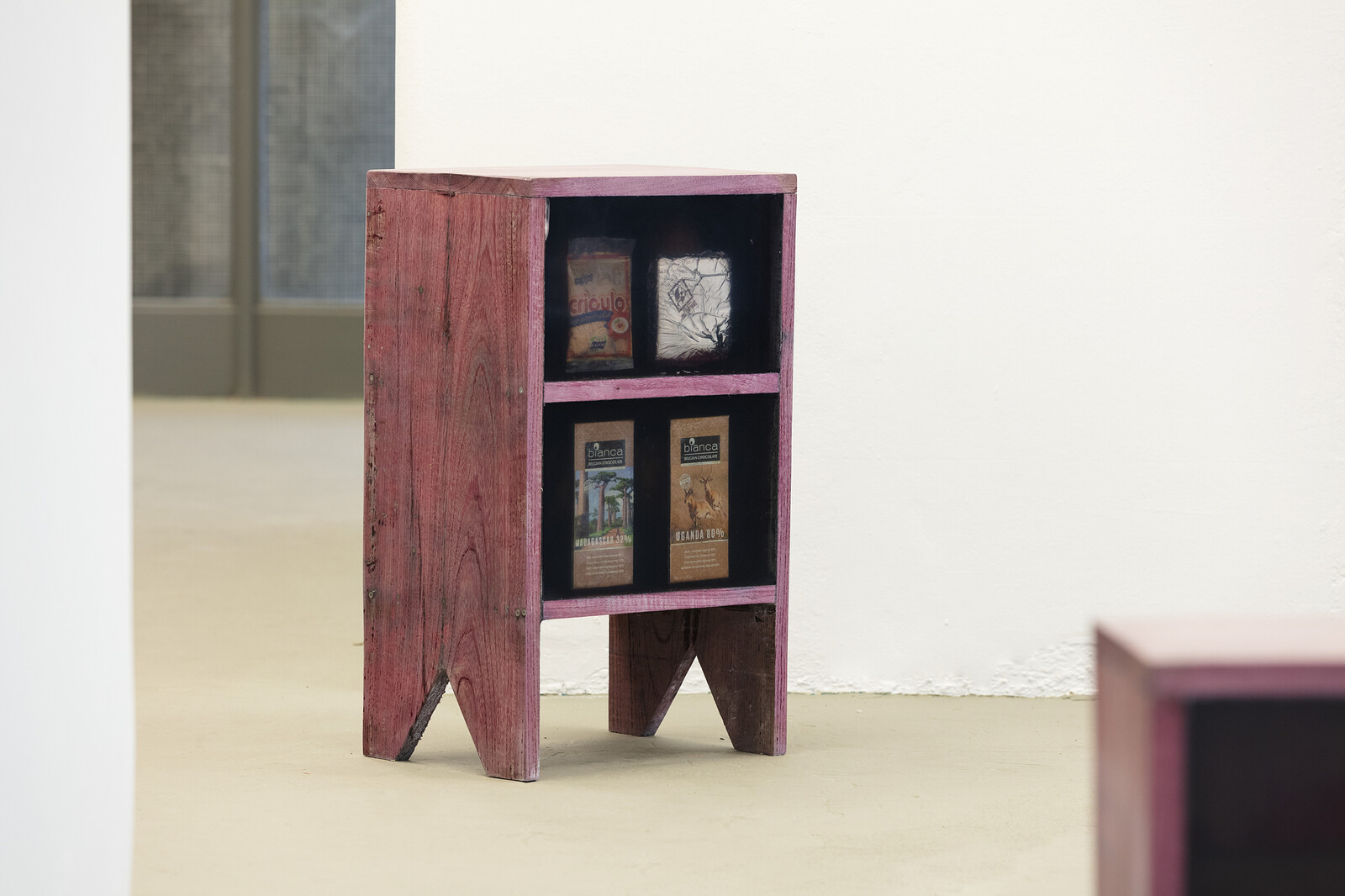 The tension of Nazareth’s identity—symbolic of both violence and fetishization—hangs over much of this presentation. As much as we see his body aestheticized, it is also subjected to degradation and assault. In the video Antropolgia do negro I (2014), the artist lies on the ground in a white vest, surrounded by human skulls which he piles on top of himself. Árvore do Esquecimento [L’Arbre D’Oublier] (2013) was a performance made by the artist at the “Tree of Forgetting” in Ouidah, Benin, around which enslaved people would historically walk to lose the memory of their freedom. In the video documentation shown here, Nazareth slowly walks backwards around the trunk, for hours on end, as if to reverse the spell. Such a video is probably hard to sell outside an institutional collection, but many of Nazareth’s objects and images are likely valuable commodities for collectors (and curators, etc) wishing to demonstrate their anti-racist credentials.