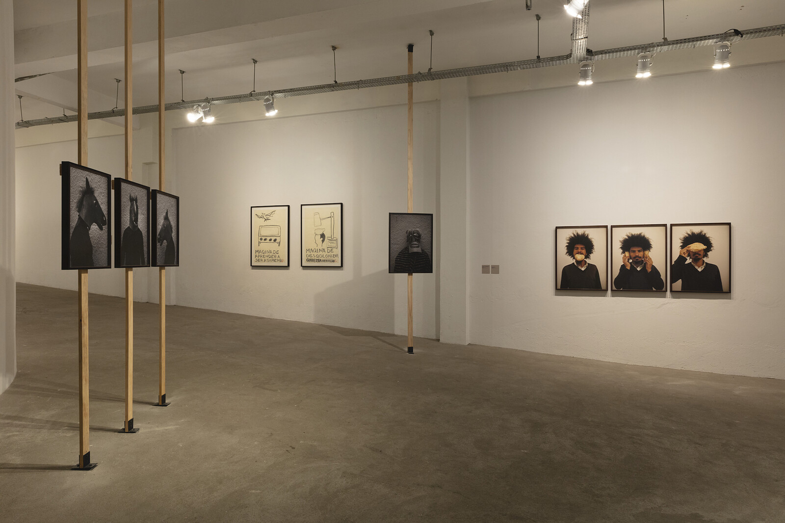In a vitrine the artist shows various objects he has picked up on his epic walks—toy trucks from walking through Africa, an Arte Popular aeroplane made out of old plastic packaging—souvenirs of found labor that would look great on a chic coffee table. A series of paintings show Black figures fighting back against the police, a reversal of the violence meted out arbitrarily against bodies of color globally by state authorities (the exhibition’s title translates as “flying kick,” a reference perhaps to the Afro-Brazilian martial art of capoeira); yet the compositions have a deliberate cute charm to them. The truism that capitalism has the ability to turn every idea, every struggle, every image to product is burlesqued in another series of photographs showing various people Nazareth found along his travels wearing T-shirts bearing Alberto Korda’s iconic image of Che Guevara silhouetted. Those in the images aren’t European students, however, but ones from the Global South, for whom the emancipatory legacy of Guevara is something worth clinging on to.