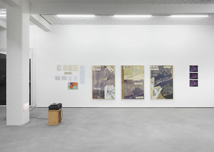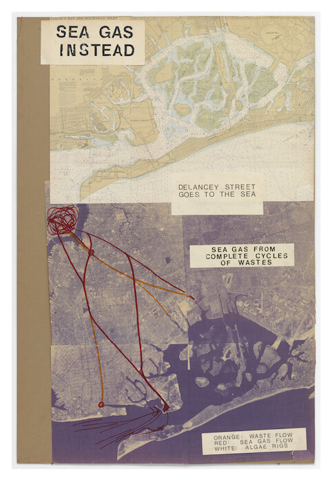 At first I had the feeling I was missing something when I encountered the documentation of unbuilt works by Peter Fend at his show “to be built” at Galerie Barbara Weiss, organized in collaboration with the project space Oracle. The drawings, prints, collages, and documents on display, mostly from the first 20 years of Fend’s practice, are billed as projects meant “to be built,” but if they’re really instructions, they’re hard to follow. For example, Delancey Street goes to the Sea, II, III, and IV, a series of quite beautiful collages from 1979, declares “CON ED / NO MAJOR GAS LINES DOWNTOWN,” with text overlaid on an aerial shot of lower Manhattan, followed by “SEA GAS INSTEAD,” the proposed solution. Red and orange lines drawn over the image demonstrate how waste pipes could be extended from Delancey Street across Brooklyn and into Jamaica Bay, and sea gas could be sent back again. Sounds like a good idea. But how, exactly, would sea gas get made from the waste? Could you really lay a pipeline in a straight shot across an entire borough? Who would finance the project? Wait, what’s sea gas again?
