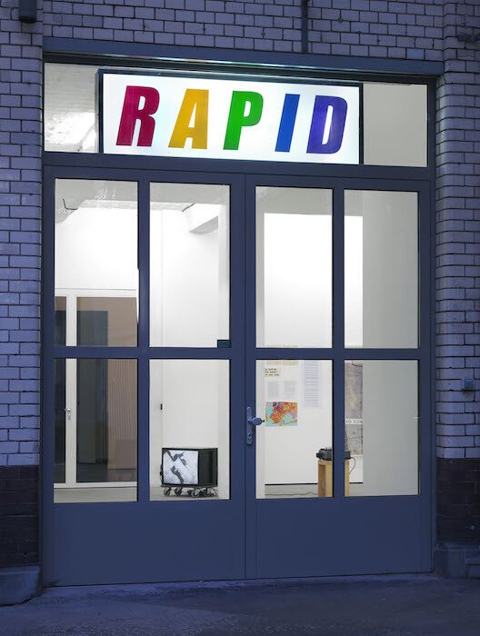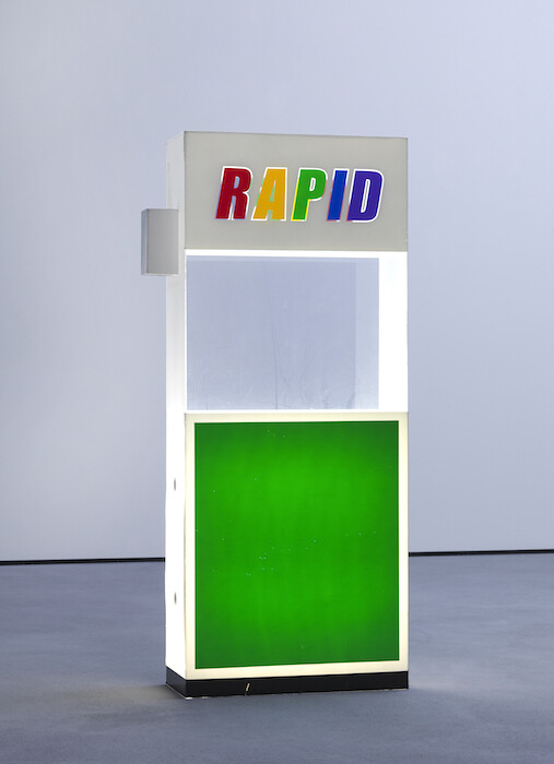 Some of the most recent works presented belong to the RAPID project, which Fend and collaborators began in 1999 under the group name “Rapid Response.” They proposed a “post-petroleum” gas station that would serve alternative fuels like methane at the pump. The five-letter RAPID logo is displayed on a lightbox on the gallery’s entrance facade (RAPID Logo, 2000), successfully branding the exhibition in an act of corporate mimicry; inside the gallery is a light-up object resembling a gas pump (RAPID Methane Gas Station, 2000).