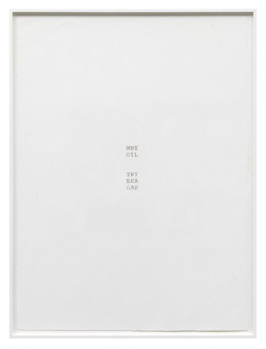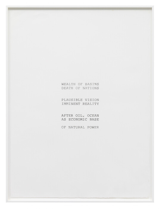 A plexiglass panel hangs in front of the first wall that the viewer encounters, museologically displaying documents: a typewritten essay from 1976 by Fend entitled “Agriculture Ends, Art Takes Over;” a mysterious pencil diagram of waste cycles; news clippings and press releases detailing Ocean Earth’s activities; and a selection of Fend’s now-well-known “word stacks”—sparse, concrete-poetry-like arrangements of text on paper. Linguistically evocative, the word stacks may be the most effective standalone pieces in the show. While they are provocations for action, they are also self-supporting aesthetic constructions that don’t rely on a forecasted external action to take effect in the exhibition context.