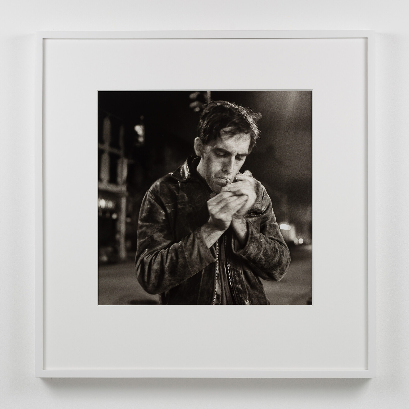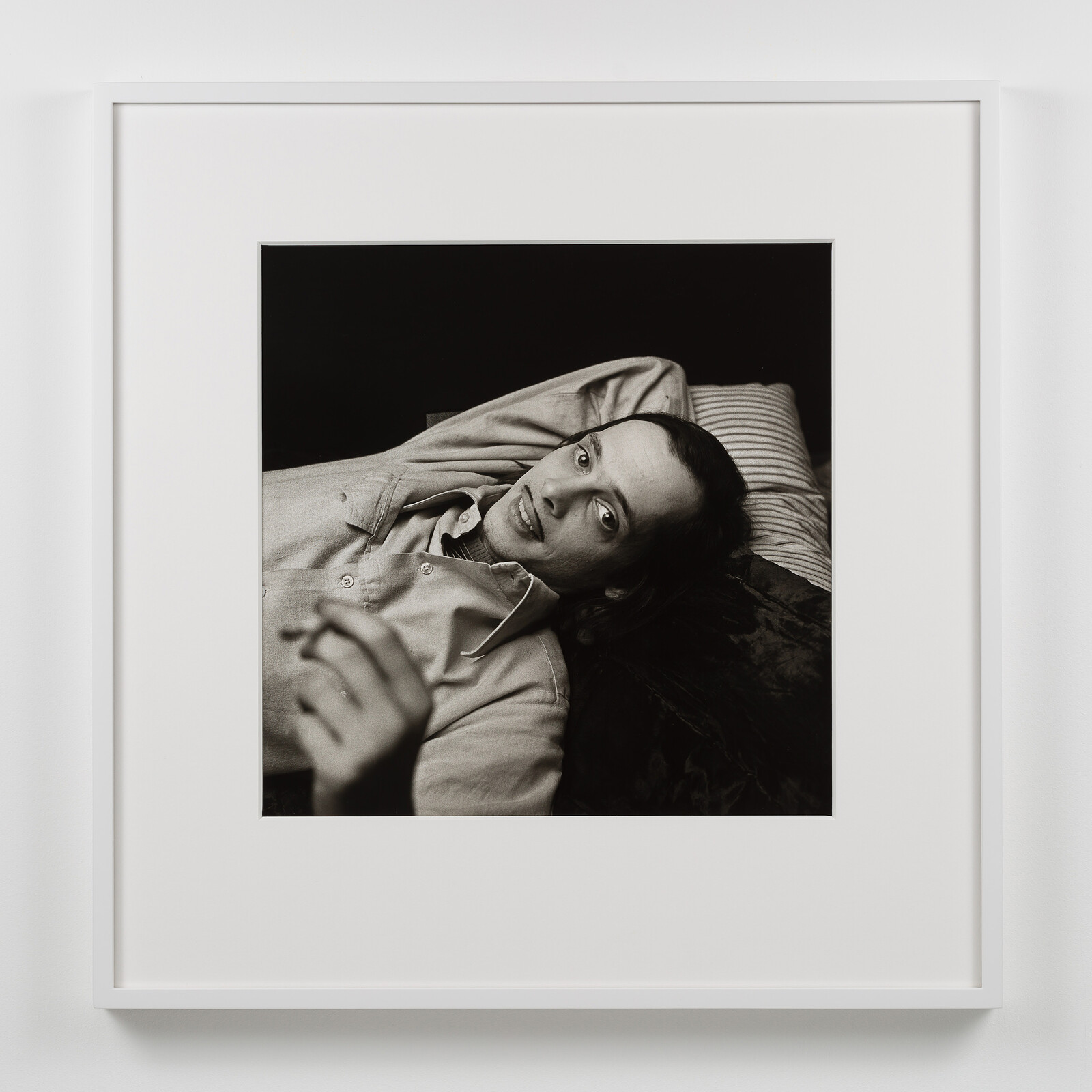 The second, smaller room displays four further estate prints: an extraordinary nude self-portrait entitled Seated Self-Portrait Depressed (1980); a portrait of Hujar’s friend the writer and raconteur Fran Lebowitz reclining in bed at her parents’ home in Morristown; one of Hujar’s sometime lover, protégé, and friend, the artist David Wojnarowicz, sparking up a cigarette on a Manhattan street with studied noir insouciance; and, finally, a portrait of an earlier lover, the artist Paul Thek, looking windswept and mercurial, a Renaissance Jesus in a hooded sweatshirt. This room, then, is clearly meant to serve as the backstage to the artist’s life.